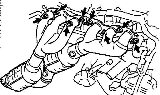 (c) Using a 14 mm deep socket wrench, install new exhaust manifold with8 new nuts. Uniformly tighten the nuts in several passes.
