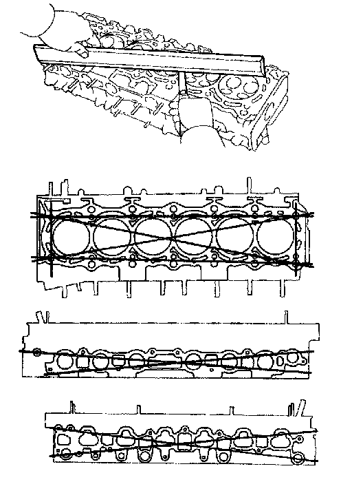 a. Inspect for the flatness. Using precision straight edge and feeler gauge, measure the surfaces contacting the cylinder block, intake and exhaust manifolds for warpage.