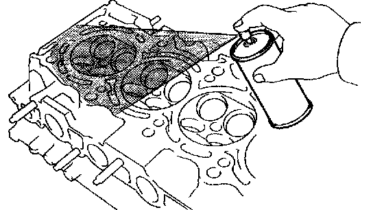 b. Inspect for the cracks. Using a dye penetrant, check the combustion chamber, intake ports, exhaust ports and cylinder block surface for cracks.