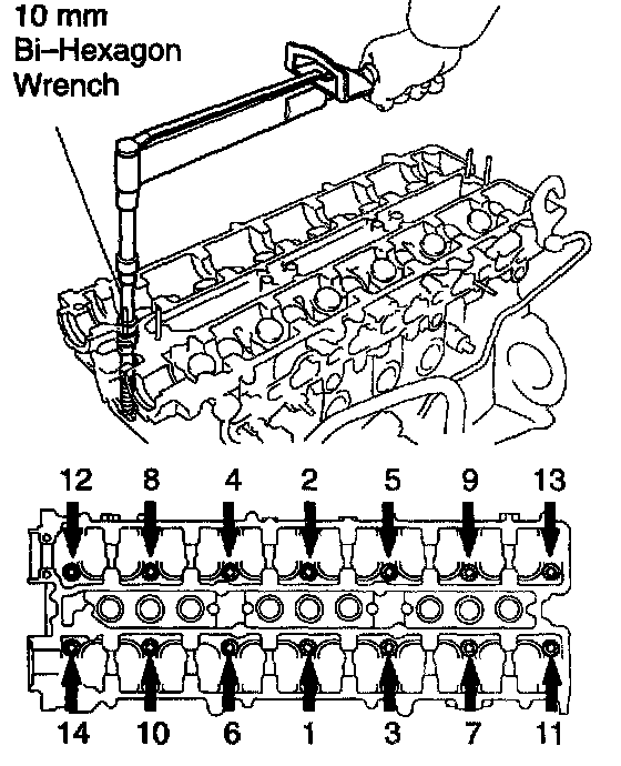 c. Using a 10 mm bi-hexagon wrench, uniformly tighten the cylinder head bolts, in several passes, in the sequence shown.