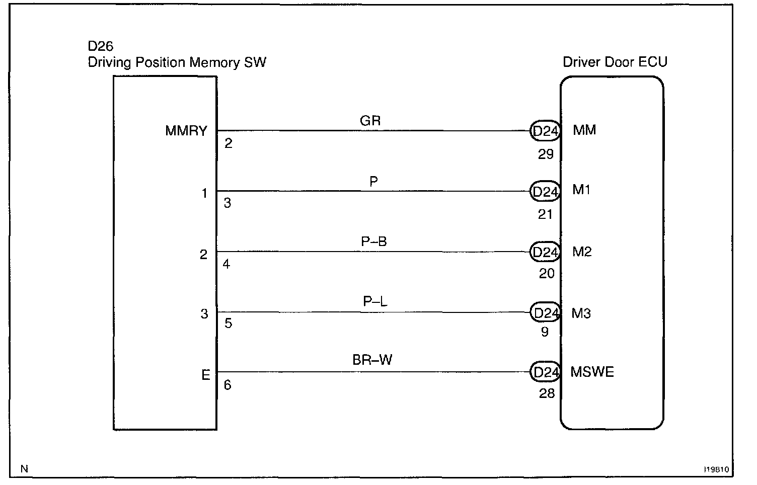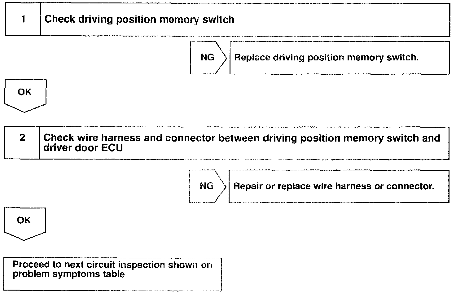 CIRCUIT DESCRIPTIONThe driver door ECU detects the condition of the driving memory switch and sends the information to the power seat ECU and the tilt and telescopic ECU via the multiplex communication circuit.