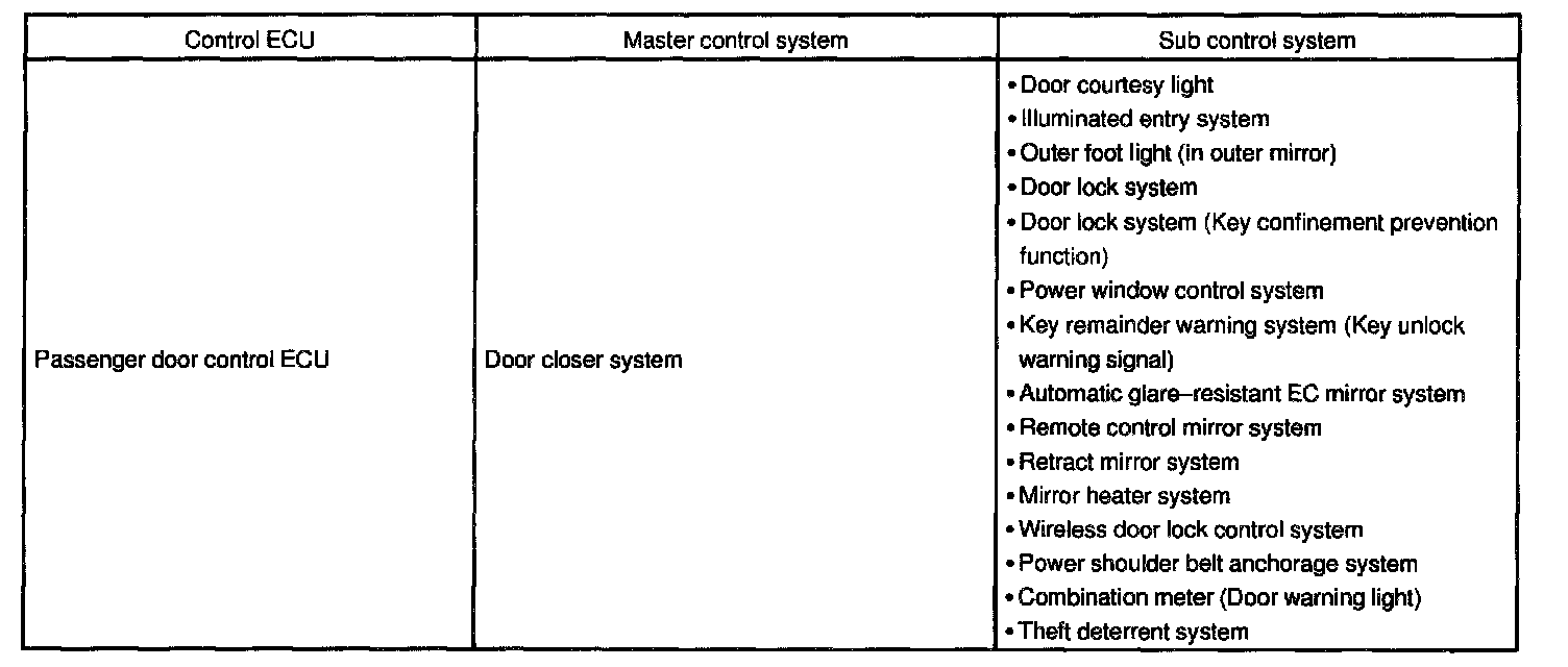 The sub control system transmits to the Master Control ECU the signals of the switches that are connected to the ECU. It also operates the motor by receiving the command of the Master Control ECU.