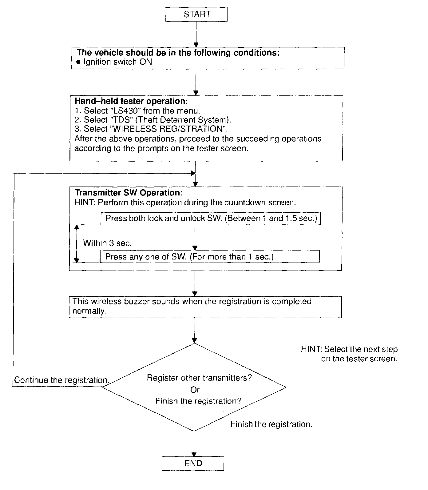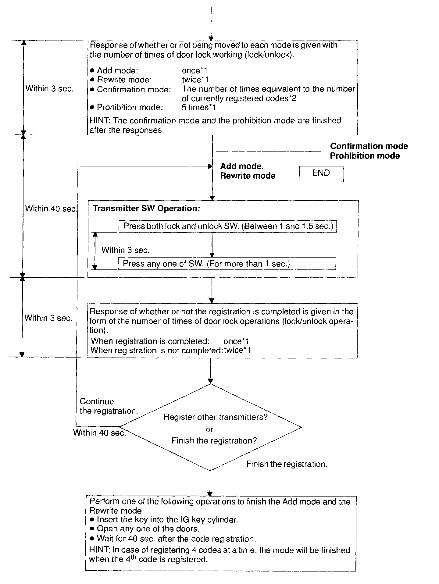 b. Follow the chart to register the transmitter recognition code to the theft deterrent ECU.