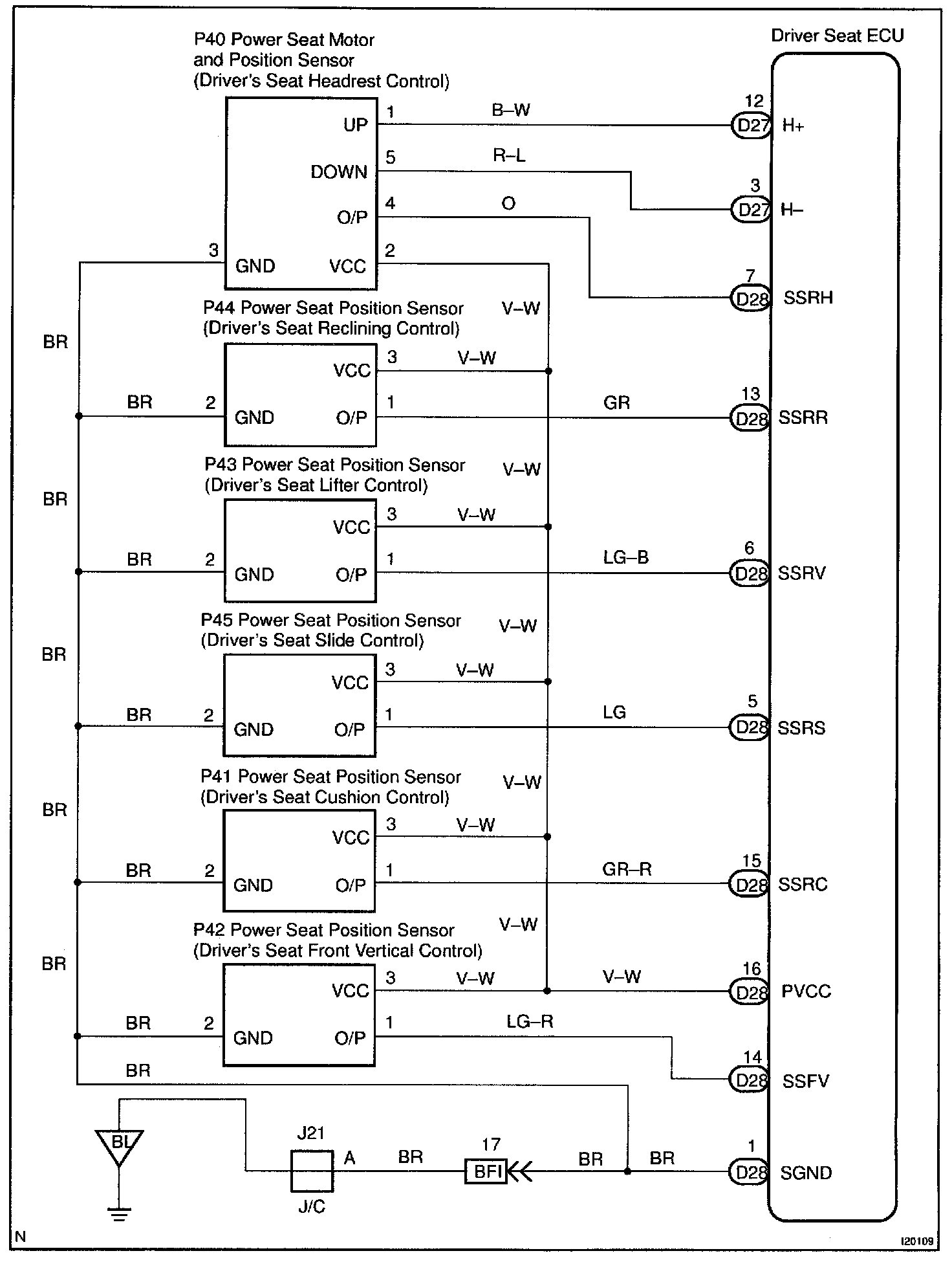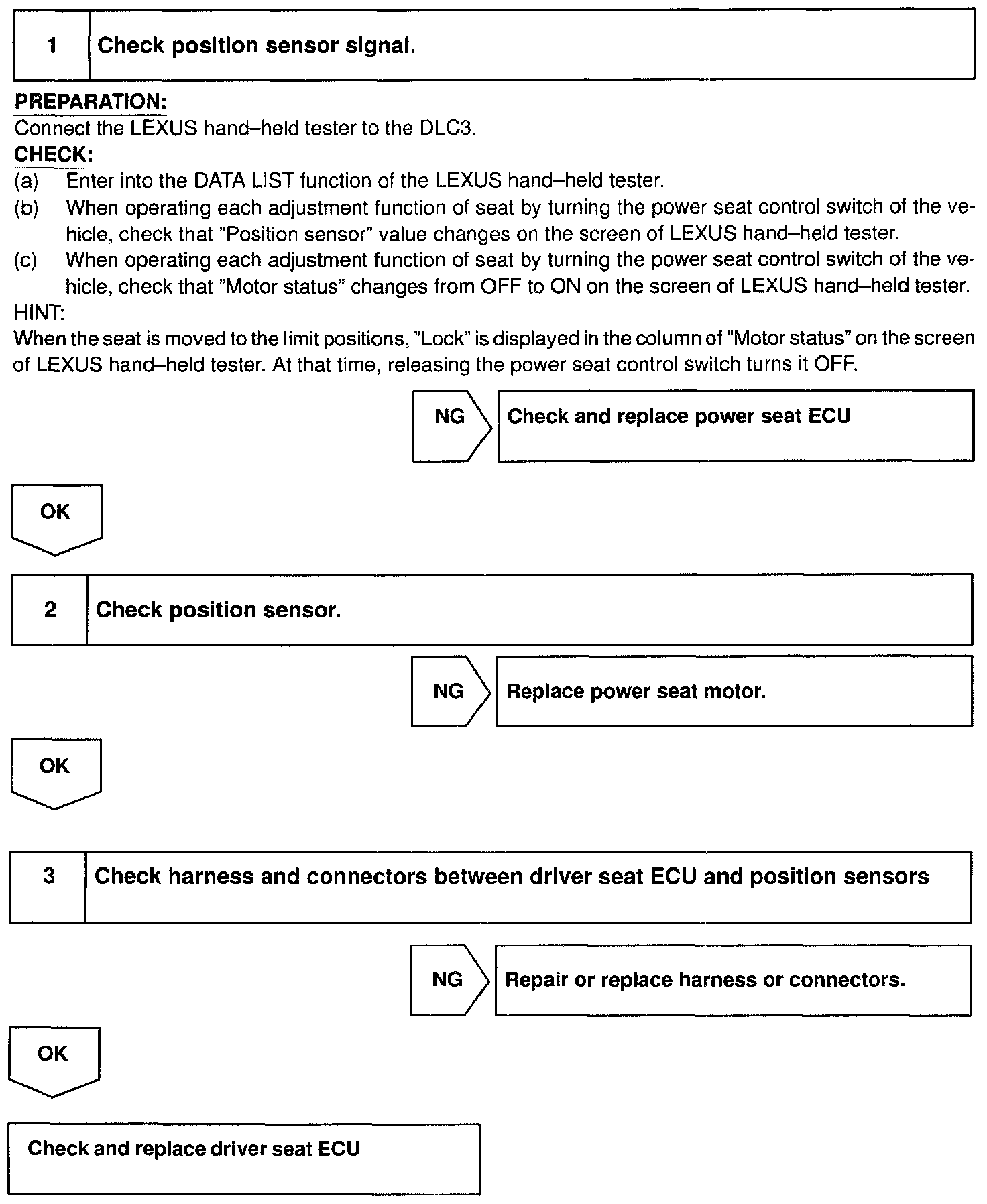 CIRCUIT DESCRIPTIONThe position sensor senses movement of the seat and sends pulse signals to the ECU.