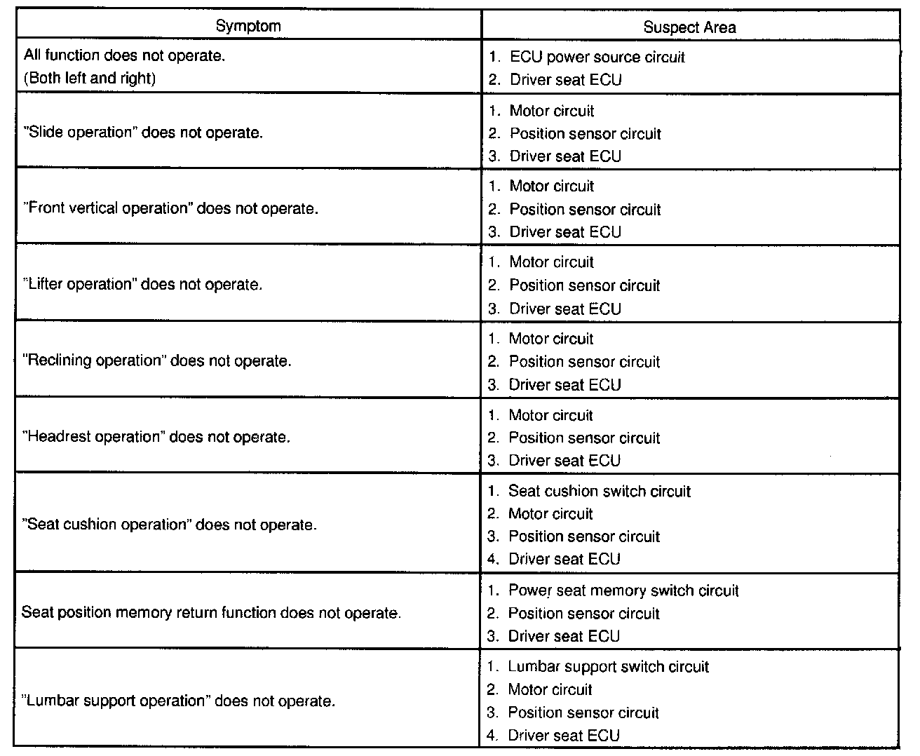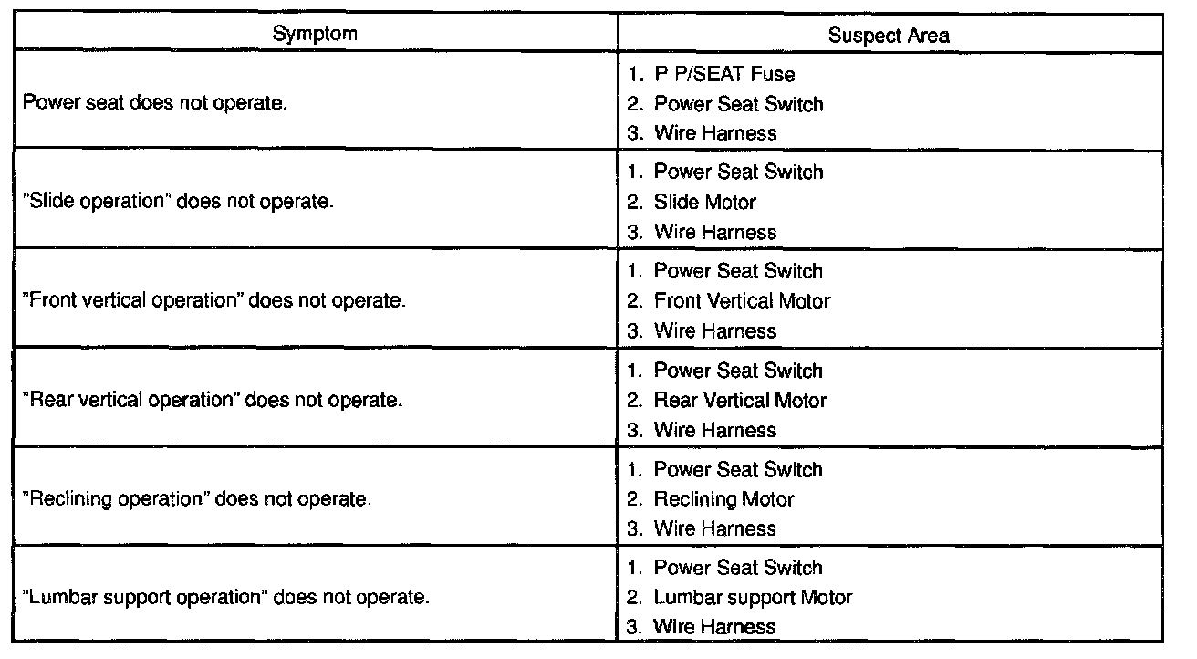 Problem Symptoms Table - Power Seat Control System (Front Passenger's Seat):