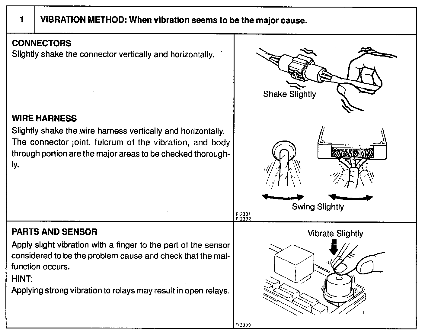 SYMPTOM SIMULATIONThe most difficult case in troubleshooting is when there are no problem symptoms occurring. In such cases, a thorough customer problem analysis must be carried out, then simulate the same or similar conditions and environment in which the problem occurred in the customer's vehicle. No matter how much experience a technician has, or how skilled he may be if he proceeds to troubleshoot without confirming the problem symptoms he will tend to overlook something important in the repair operation and make a wrong guess somewhere, which will only lead to a standstill. For example, for a problem which only occurs when the engine is cold, or for a problem which occurs due to vibration caused by the road during driving, etc., the problem can never be determined so long as the symptoms are confirmed with the engine hot condition or the vehicle at a standstill. Since vibration, heat or water penetration (moisture) is likely cause for problem which is difficult to reproduce, the symptom simulation tests introduced here are effective measures in that the external causes are applied to the vehicle in a stepped condition.
