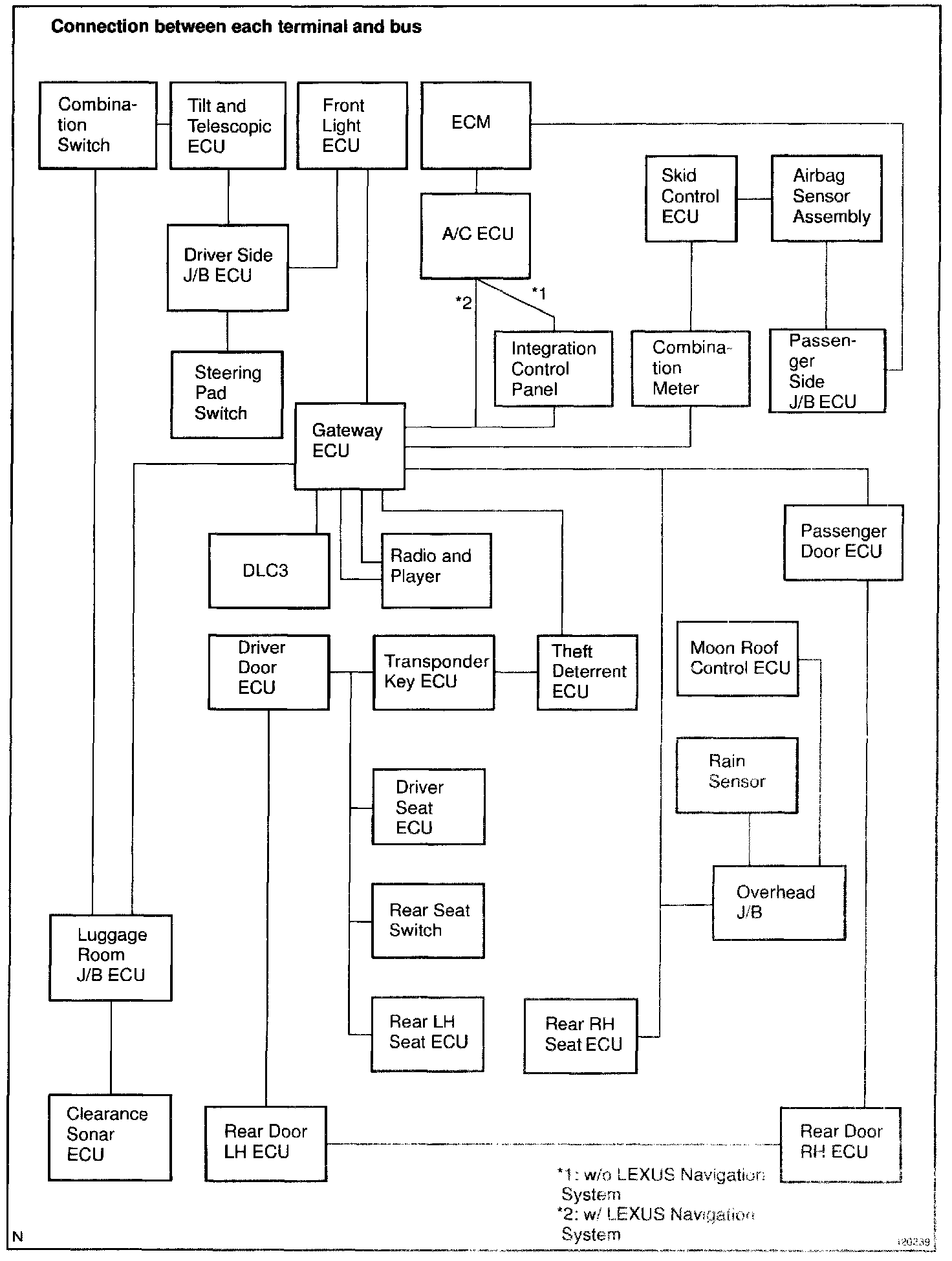 This multiplex communication (gateway) system consists of 3 BEANs (Body Electrical Area Networks): the door system communication bus; the instrument panel system communication bus and the light system communication bus and AVC-LAN (Audio Visual Communication-Local Area Network) communication bus related to the audio and navigation system. (Dealer option (cellular mobile phone, etc.) communication network can be added to the above.)