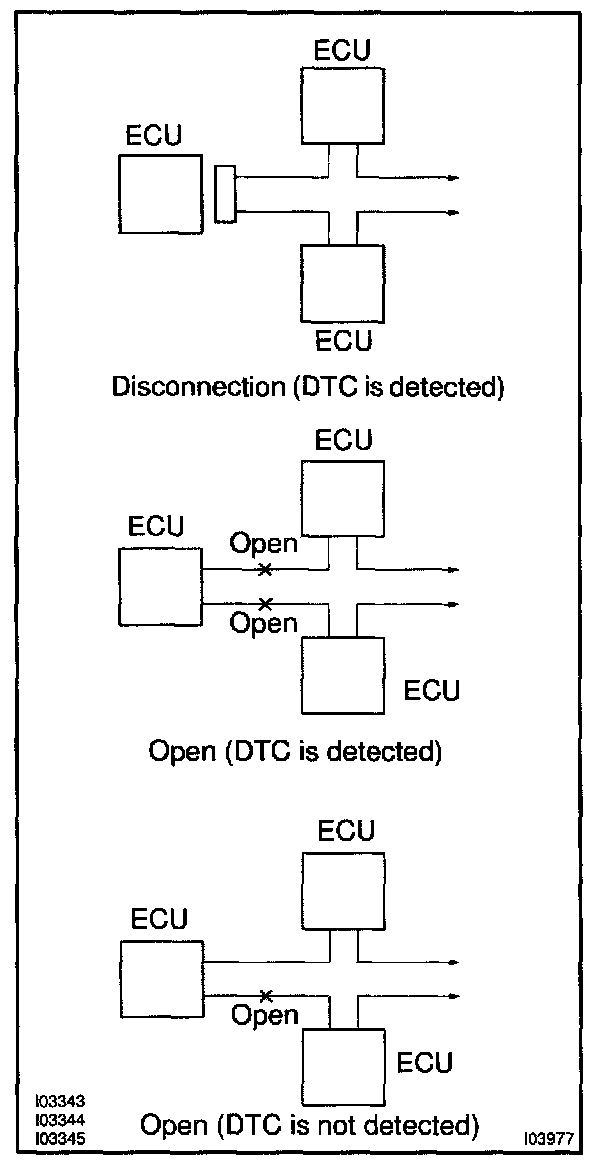 b. If DTC of ECU communication stop is output, connectors may be disconnected, or communication buses may be open at 2 points. It will not become abnormal with only 1 communication bus open.