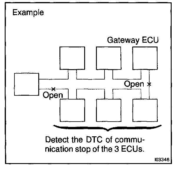 c. If 2 communication buses are open at the position as shown in the illustration, DTC of ECU communication stop between those 2 buses is output.