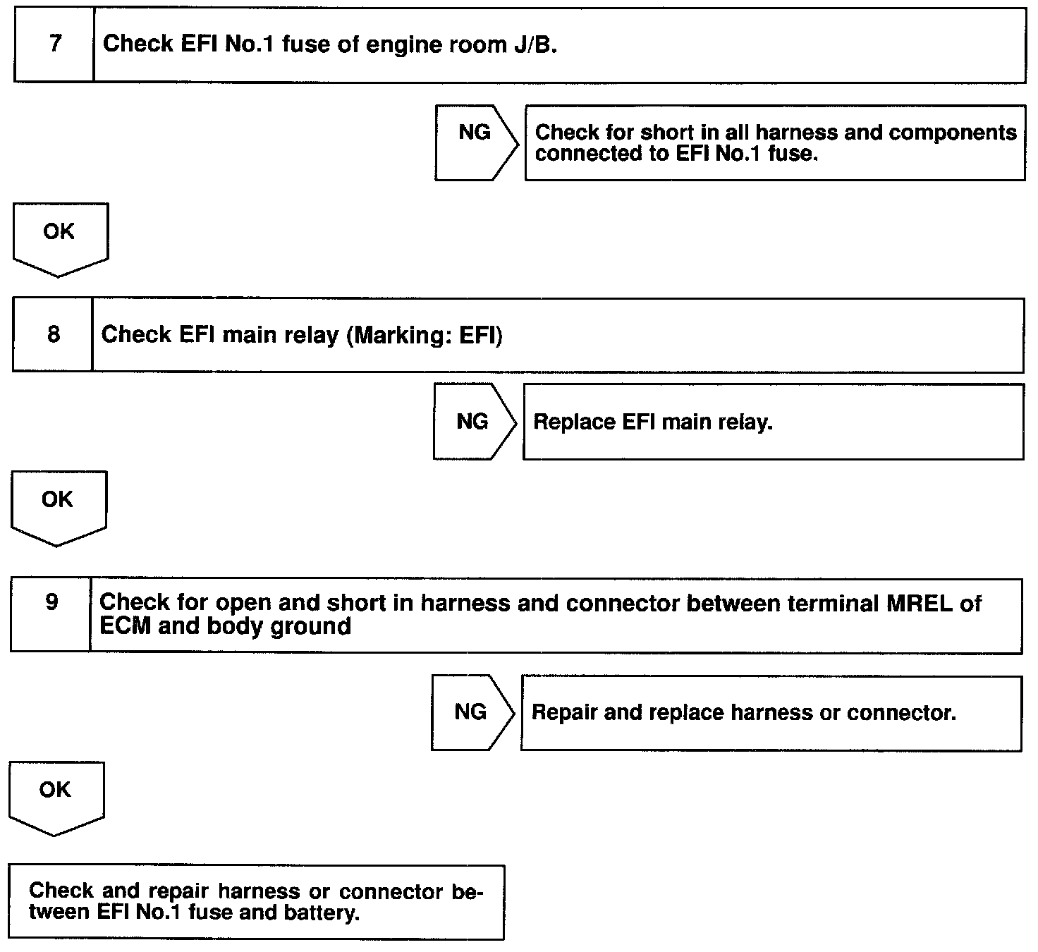 CIRCUIT DESCRIPTIONWhen the ignition switch is turned ON, battery positive voltage is applied to terminal IGSW of the ECM and the EFI main relay (Marking: EFI) control circuit in the ECM sends a signal to terminal MREL of the ECM switching on the EFI main relay.