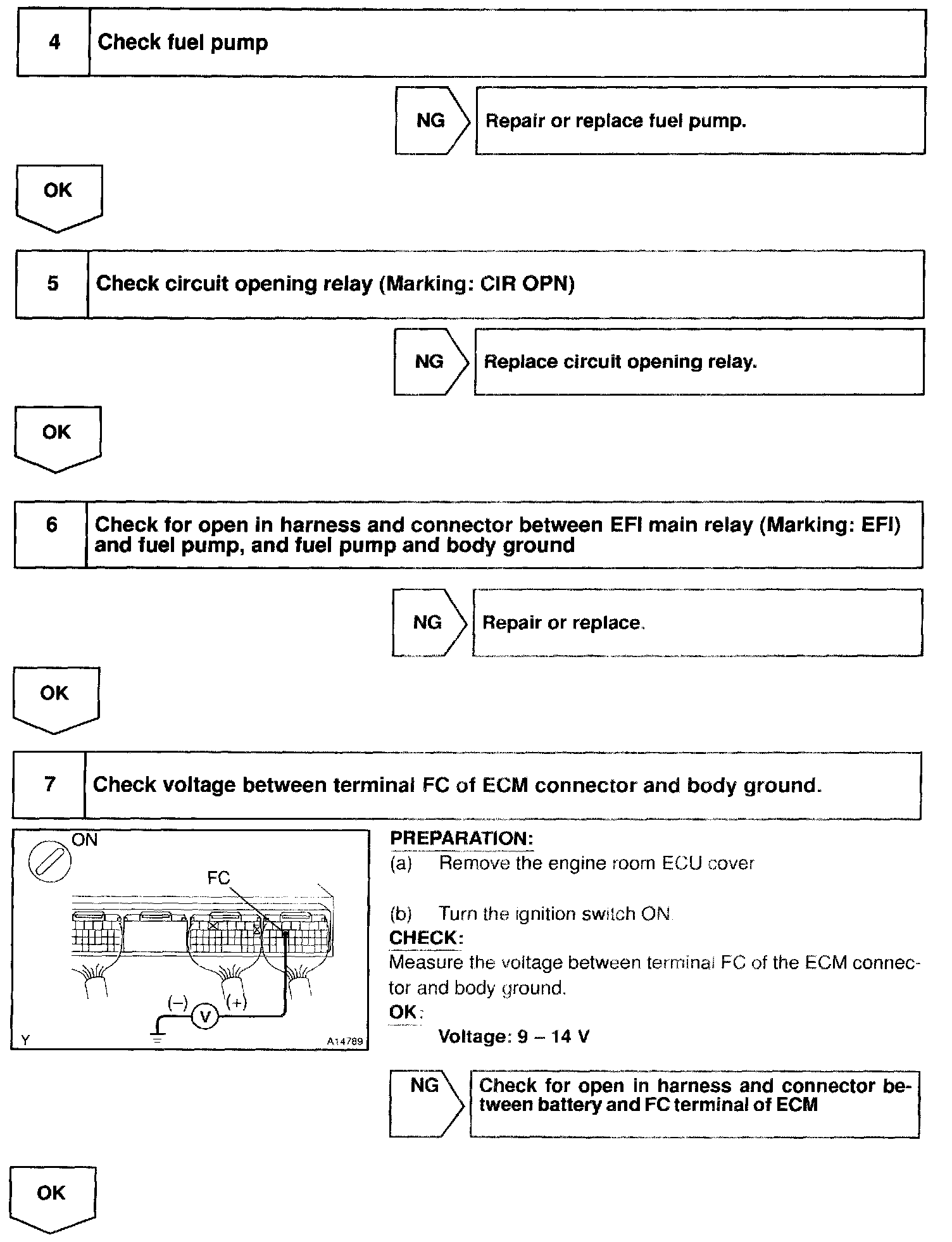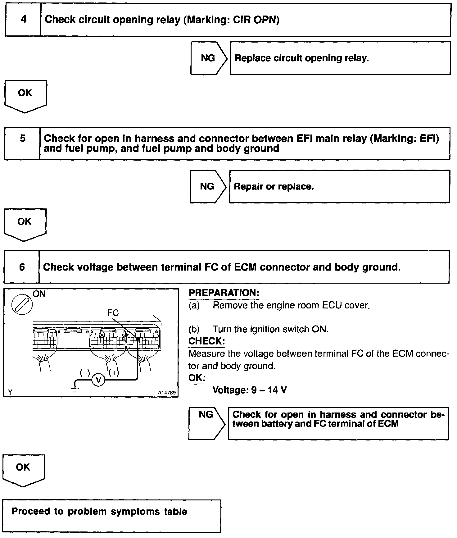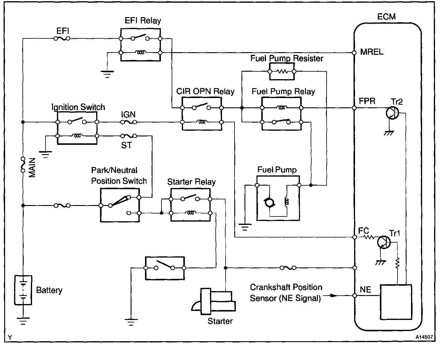 When the STA signal and NE signal are input to the ECM, Tr1 is turned ON, current flows to coil of the circuit opening relay, the relay switches on, power is supplied to the fuel pump and the fuel pump operates. While the NE signal is generated (engine running), the ECM keeps Tr1 ON (circuit opening relay ON) and the fuel pump also keeps operating.