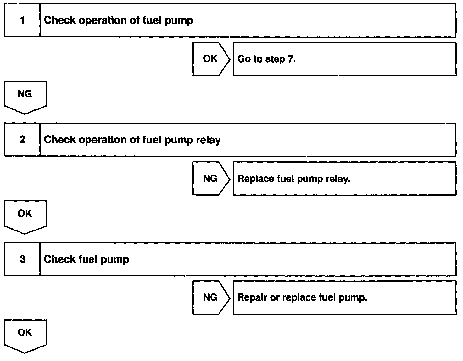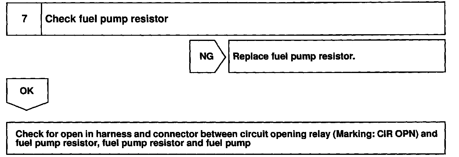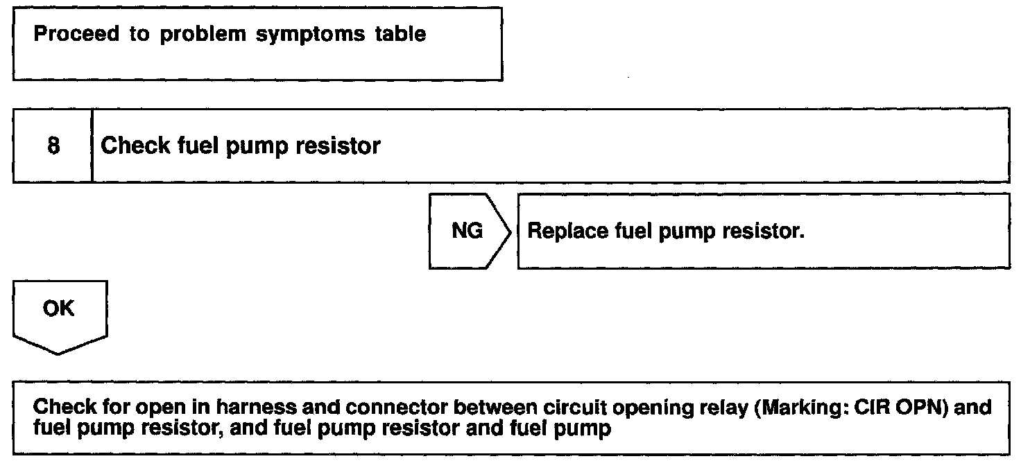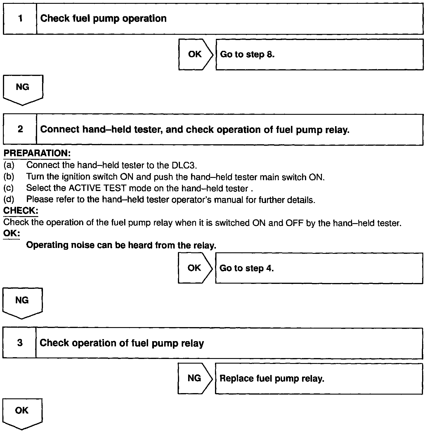 When the STA signal and NE signal are input to the ECM, Tr1 is turned ON, current flows to coil of the circuit opening relay, the relay switches on, power is supplied to the fuel pump and the fuel pump operates. While the NE signal is generated (engine running), the ECM keeps Tr1 ON (circuit opening relay ON) and the fuel pump also keeps operating.
