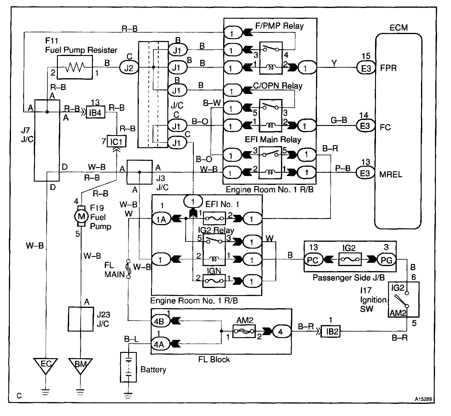 The fuel pump speed is controlled at two levels (high speed or low speed) by the condition of the engine (starting, light load, heavy load). When the engine starts (STA ON), Tr2 in the ECM is OFF, so the fuel pump relay closes and battery voltage is applied directly to the fuel pump. Fuel pump operates at high speed. After the engine starts during idling or light loads, since Tr2 goes ON, power is supplied to the fuel pump via the fuel pump resistor.