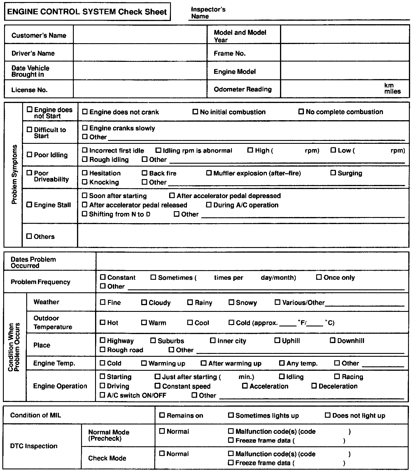 Engine Control System Check Sheet: