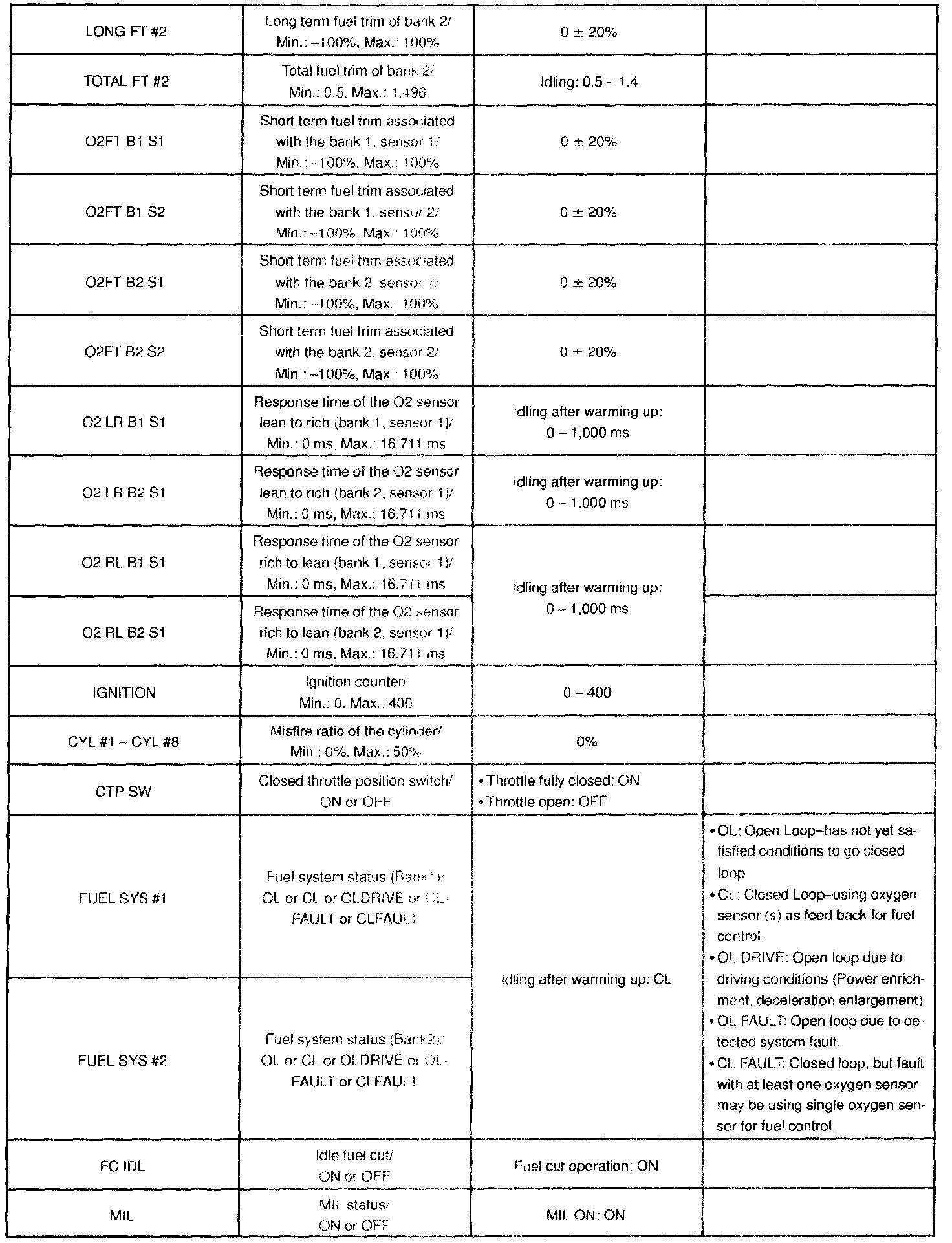 DATA LISTNOTE: The values given below for "Normal Condition" are representative values. So, a vehicle may still be normal even if its value differs from those listed here. So, do not solely depend on the "Normal Condition" here when deciding whether a part is faulty or not.