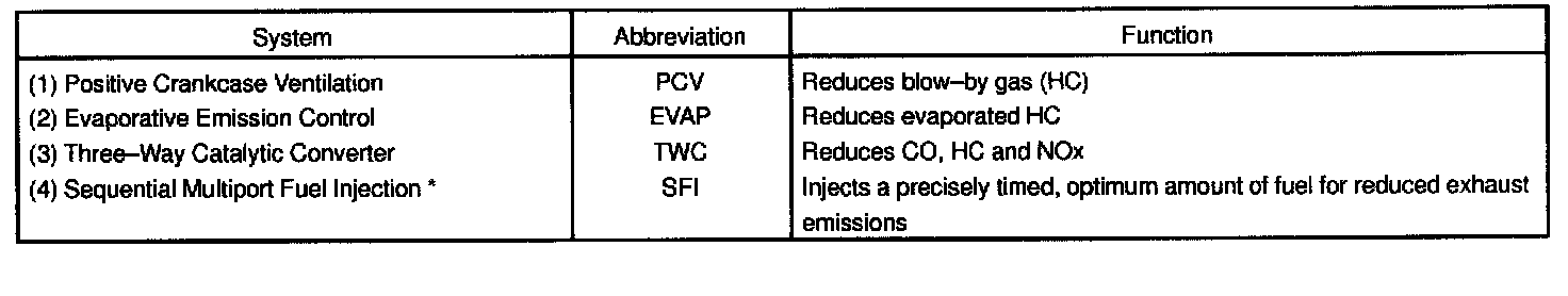 The emission control systems are installed to reduce the amount of CO, HC and NOx exhausted from the engine (3) and (4)), to prevent the atmospheric release of blow-by gas-containing HC (1) and evaporated fuel containing HC being released from the fuel tank (2).