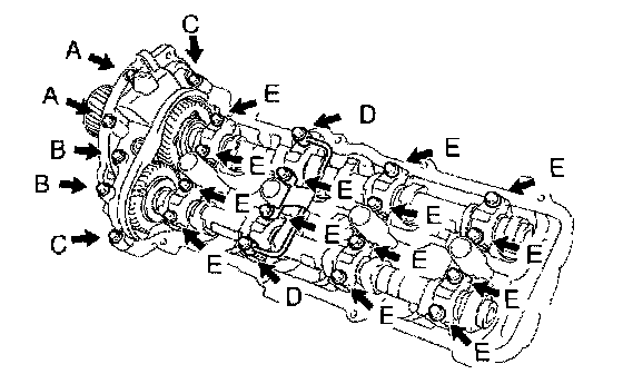Note: Install a new seal washer to the bearing cap bolt (A and B). Apply a light coat of engine oil on the threads and under the heads of the bearing cap bolts (D and E). Do not apply engine oil under the heads of the bearing cap bolt (A), (B) and (C).
