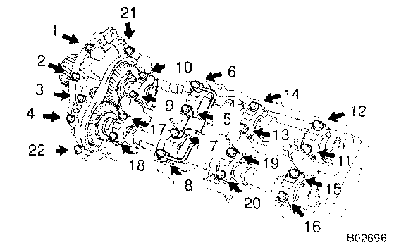 NOTE:Install the oil feed pipe and the 22 bearing cap bolts as shown in the illustration. Uniformly tighten the 22 bearing cap bolts in several passes, in the sequence shown.