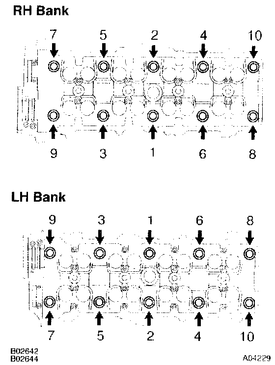 Note: Mark the front of the cylinder head bolt head with paint. Retighten the cylinder head bolts by 90° in the numerical order shown. Check that the painted mark is now at a 90° angle to front.