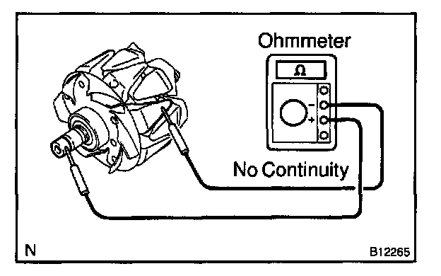 Using an ohmmeter, check that there is no continuity between the slip ring and rotor.