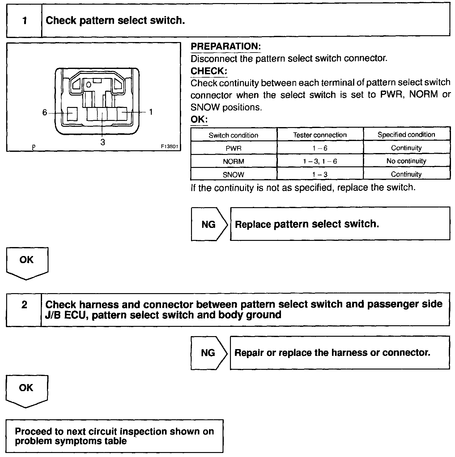 CIRCUIT DESCRIPTIONThe ECM memory contains the shift programs for the NORMAL, POWER and SNOW patterns, 2 position,L position and the lock-up patterns By following the programs corresponding to the signals from the pattern select switch, the neutral start and other various sensors, the ECM switches the solenoid valves ON and OFF, and controls the transmission gear change and the lock-up clutch operation.