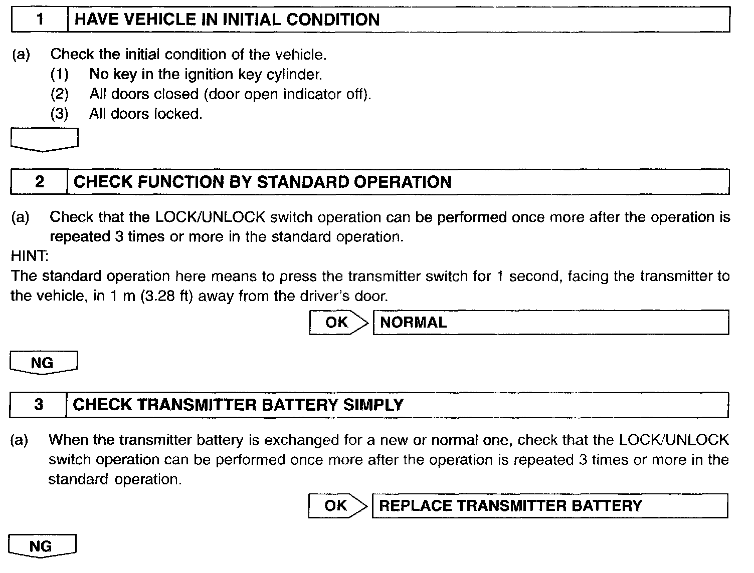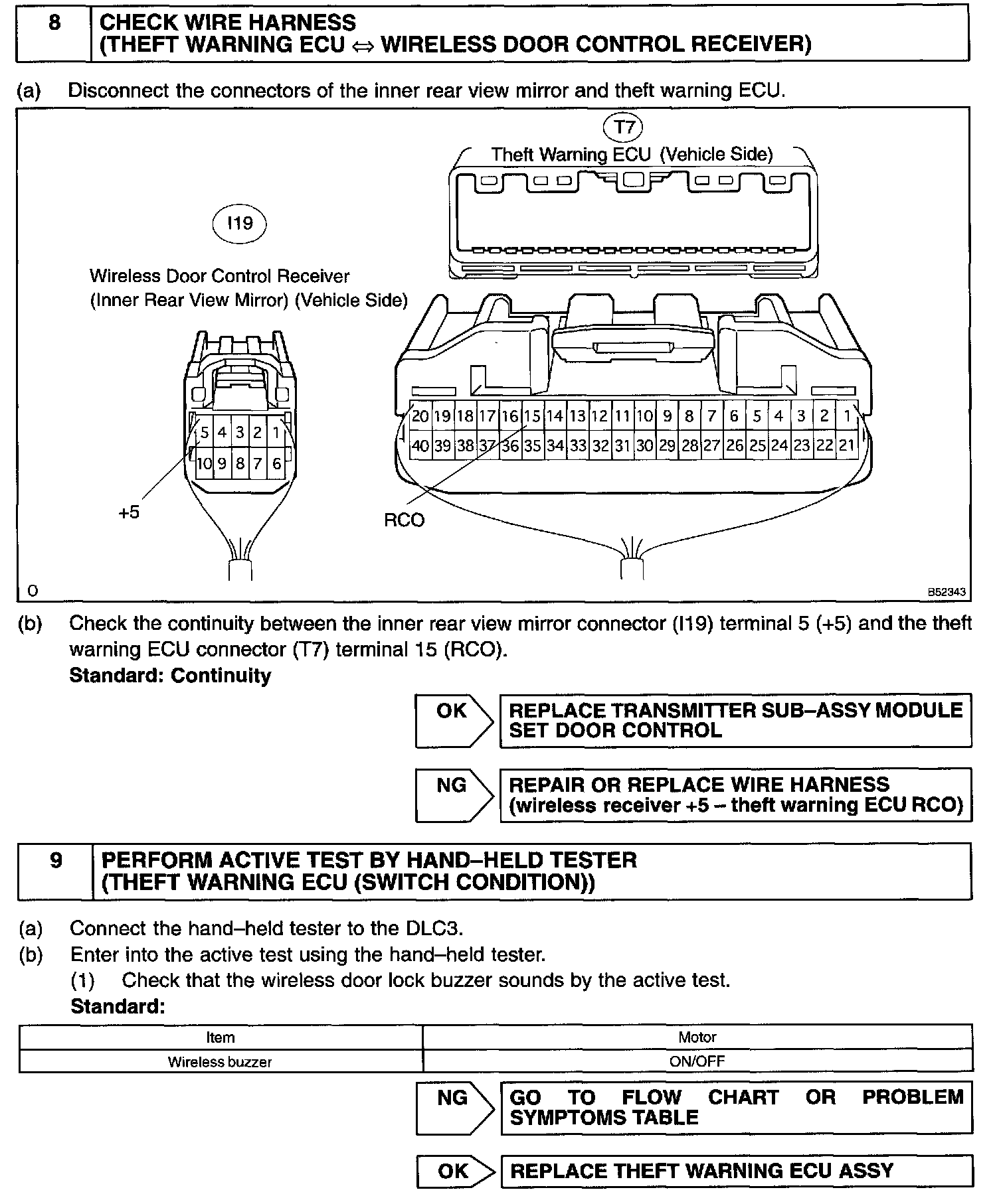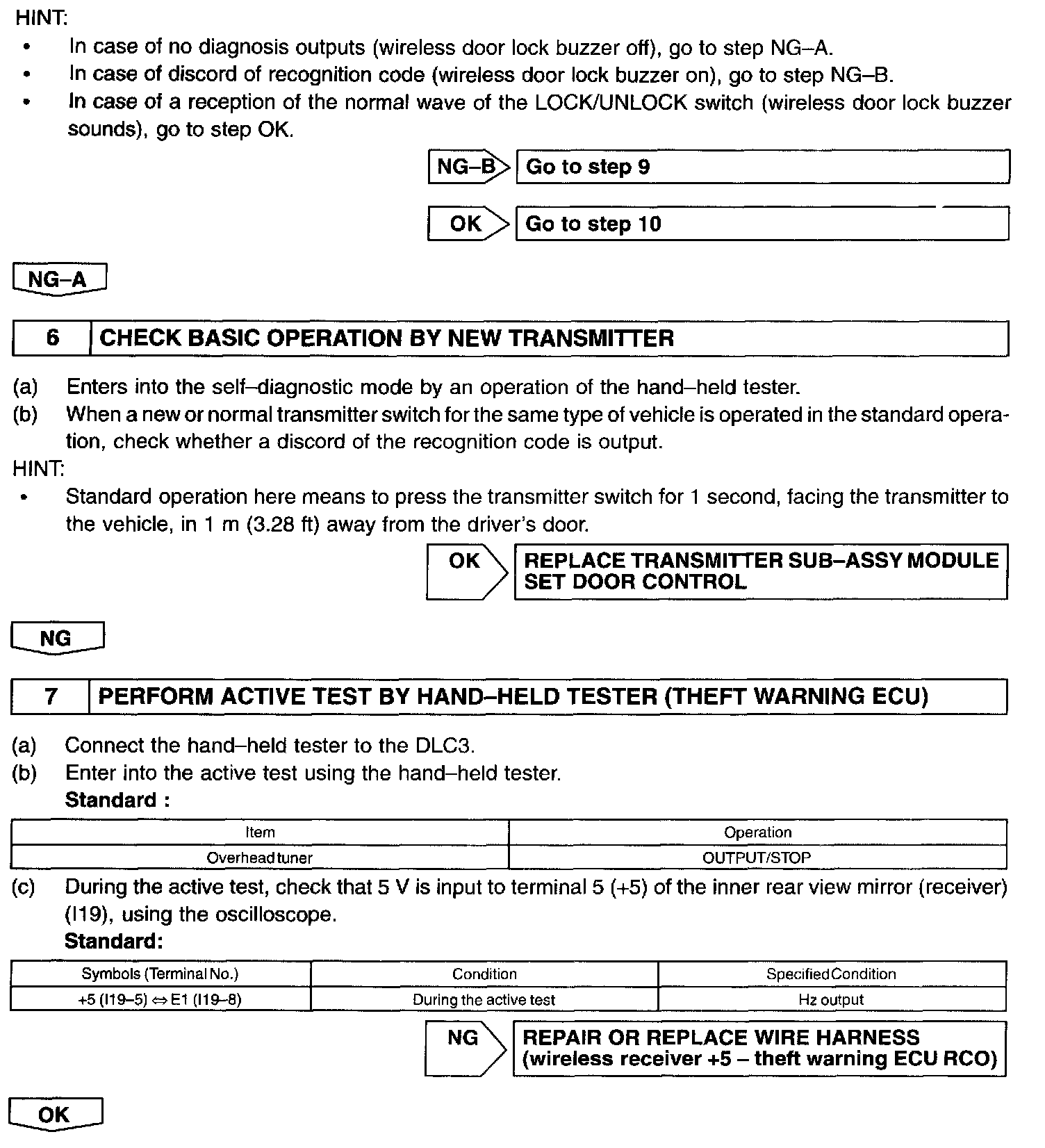 NOTE: The multiplex function control system has a function with large-scale multiplex communications. First of all, inspect the communication function depending on the "How To Proceed With Troubleshooting", and check that there is no abnormality in the communication system. Then finally proceed with the troubleshooting. Also, when a short circuit exists in the wire harness between the theft warning ECU and the door control receiver, diagnostic trouble code (DTC) B1242 is output and the wireless function does not operate.