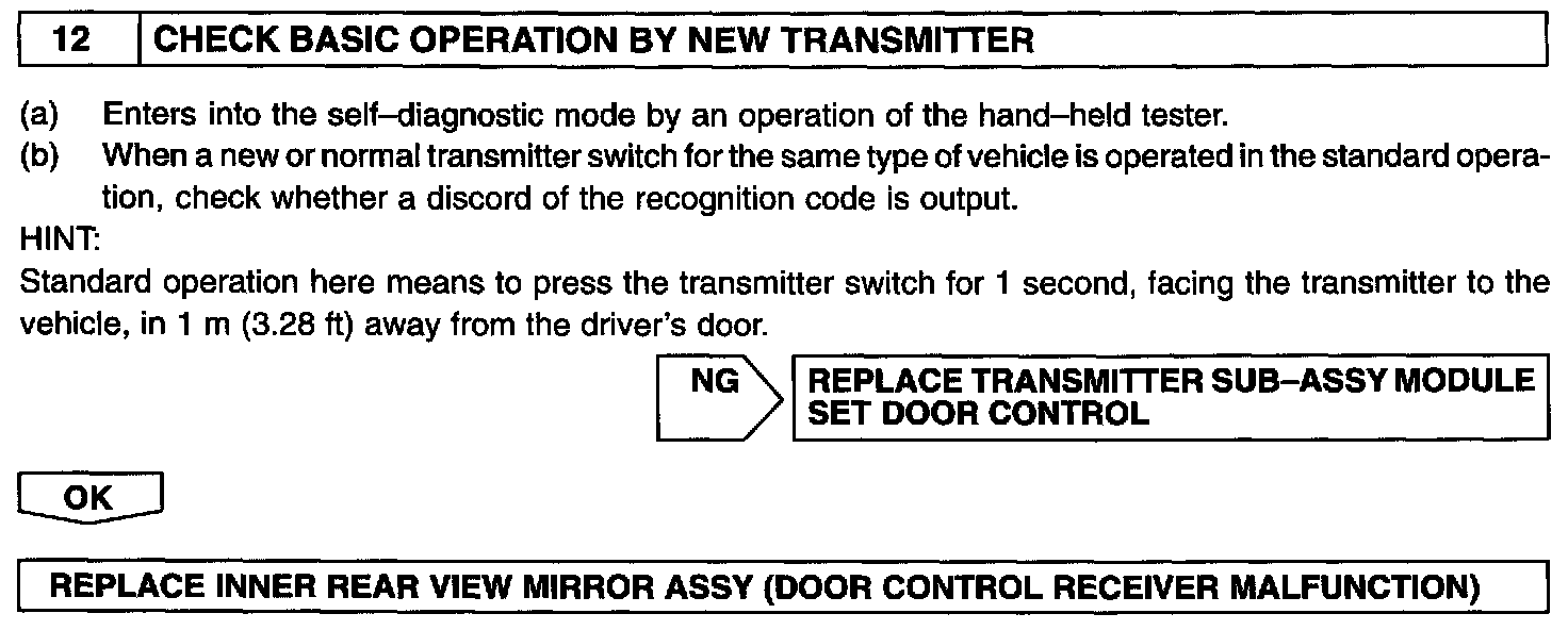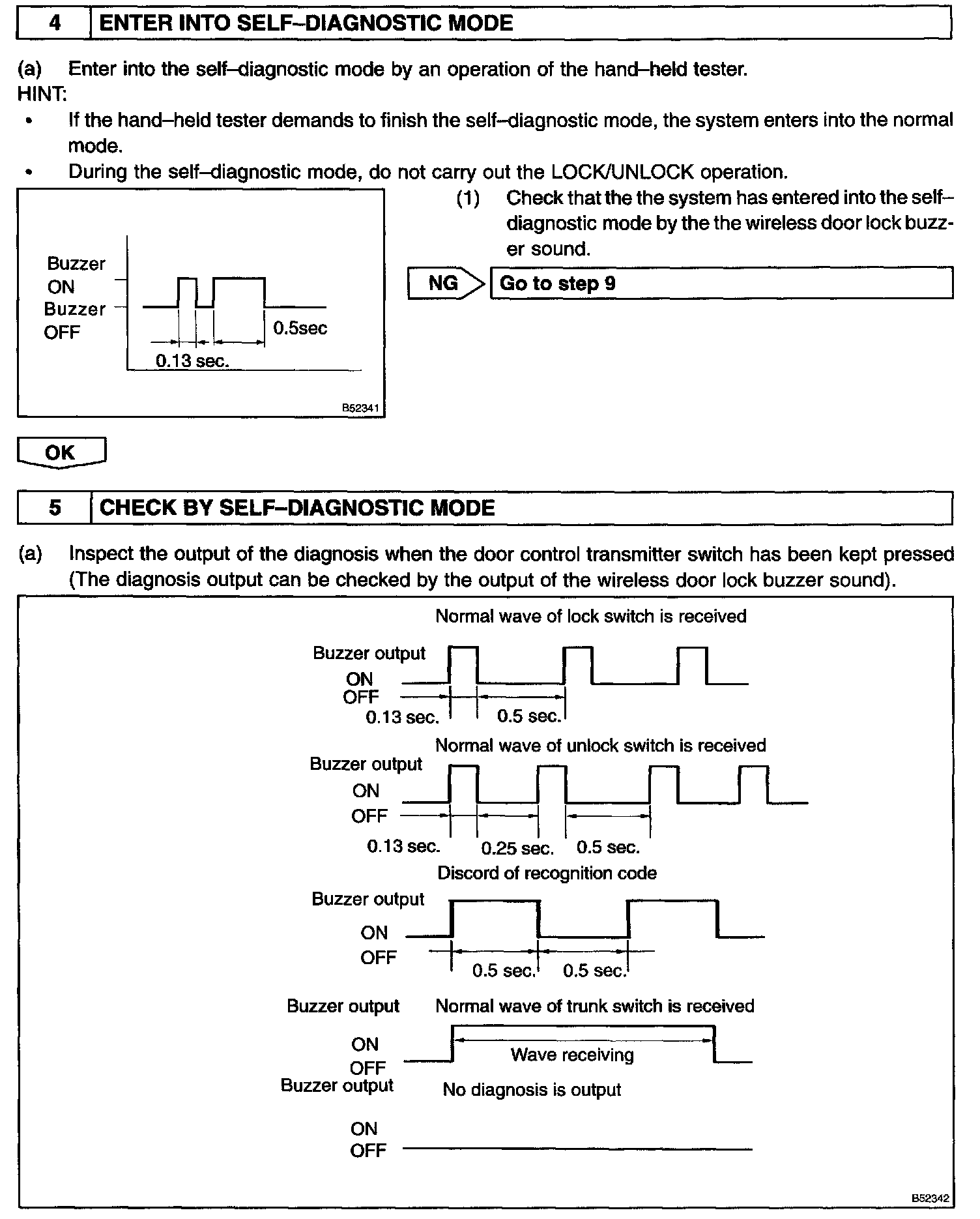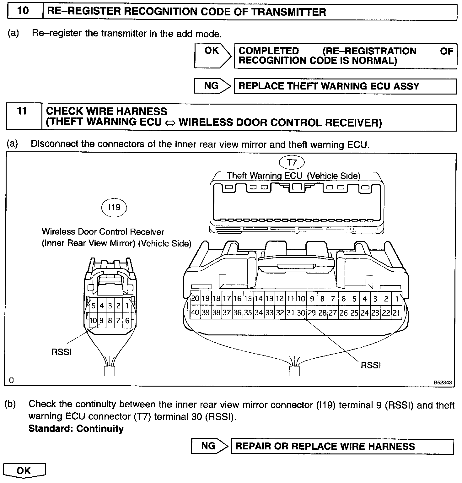 NOTE: The multiplex function control system has a function with large-scale multiplex communications. First of all, inspect the communication function depending on the "How To Proceed With Troubleshooting", and check that there is no abnormality in the communication system. Then finally proceed with the troubleshooting. Also, when a short circuit exists in the wire harness between the theft warning ECU and the door control receiver, diagnostic trouble code (DTC) B1242 is output and the wireless function does not operate.