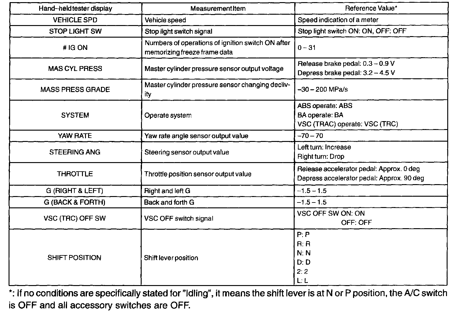 a. The vehicle (sensor) status memorized during ABS and/or VSC operation or at the time of error code detection can be displayed using the LEXUS hand-held tester.