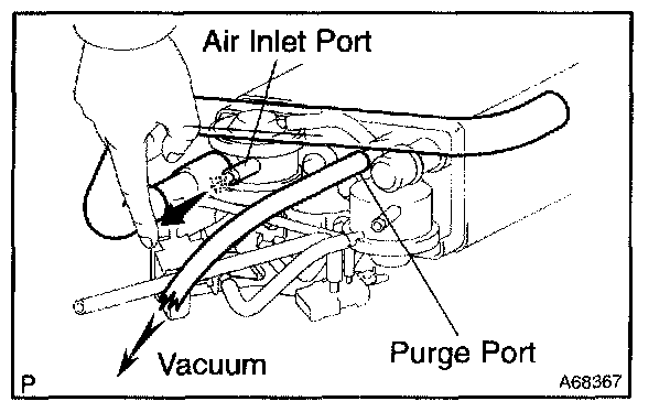 5. While holding the air inlet port closed, apply vacuum (3.43 kpa, 25.7 mmHg, 1.01 in.Hg) to the EVAP port to check that air flows into the purge port.