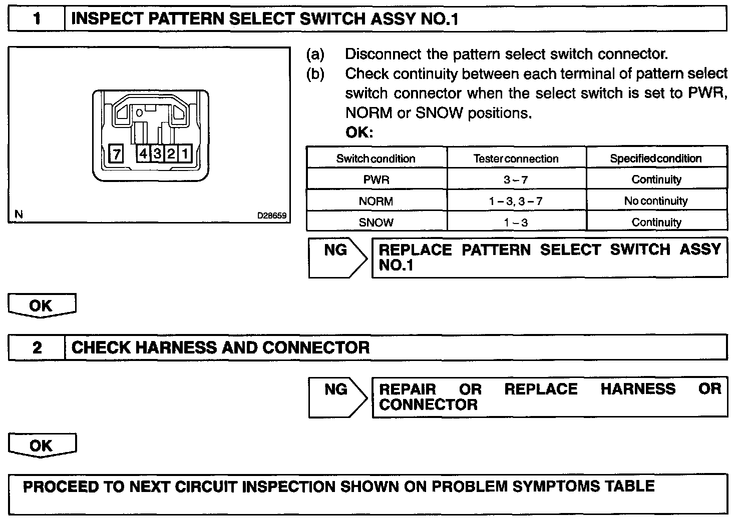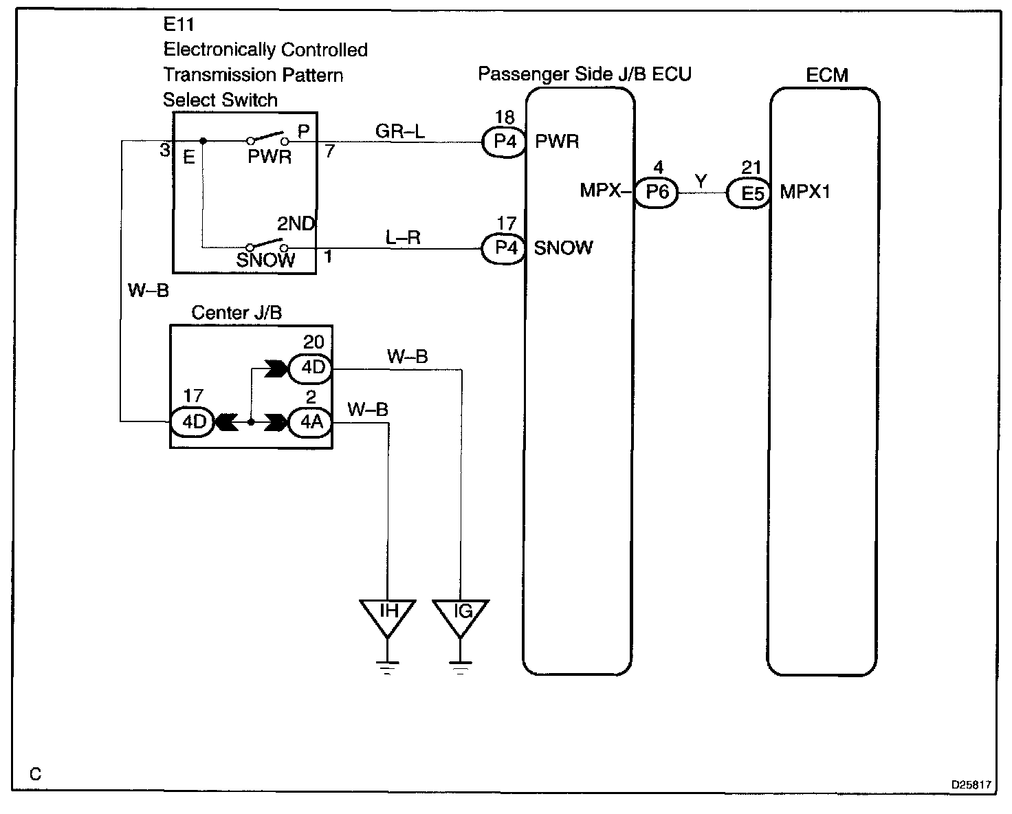 The ECM memory contains the shift programs for the NORMAL, POWER and SNOW patterns, 2 position, L position and the lock-up patterns. By following the programs corresponding to the signals from the pattern select switch, the neutral start and other various sensors, the ECM switches the solenoid valves ON and OFF, and controls the transmission gear change and the lock-up clutch operation.