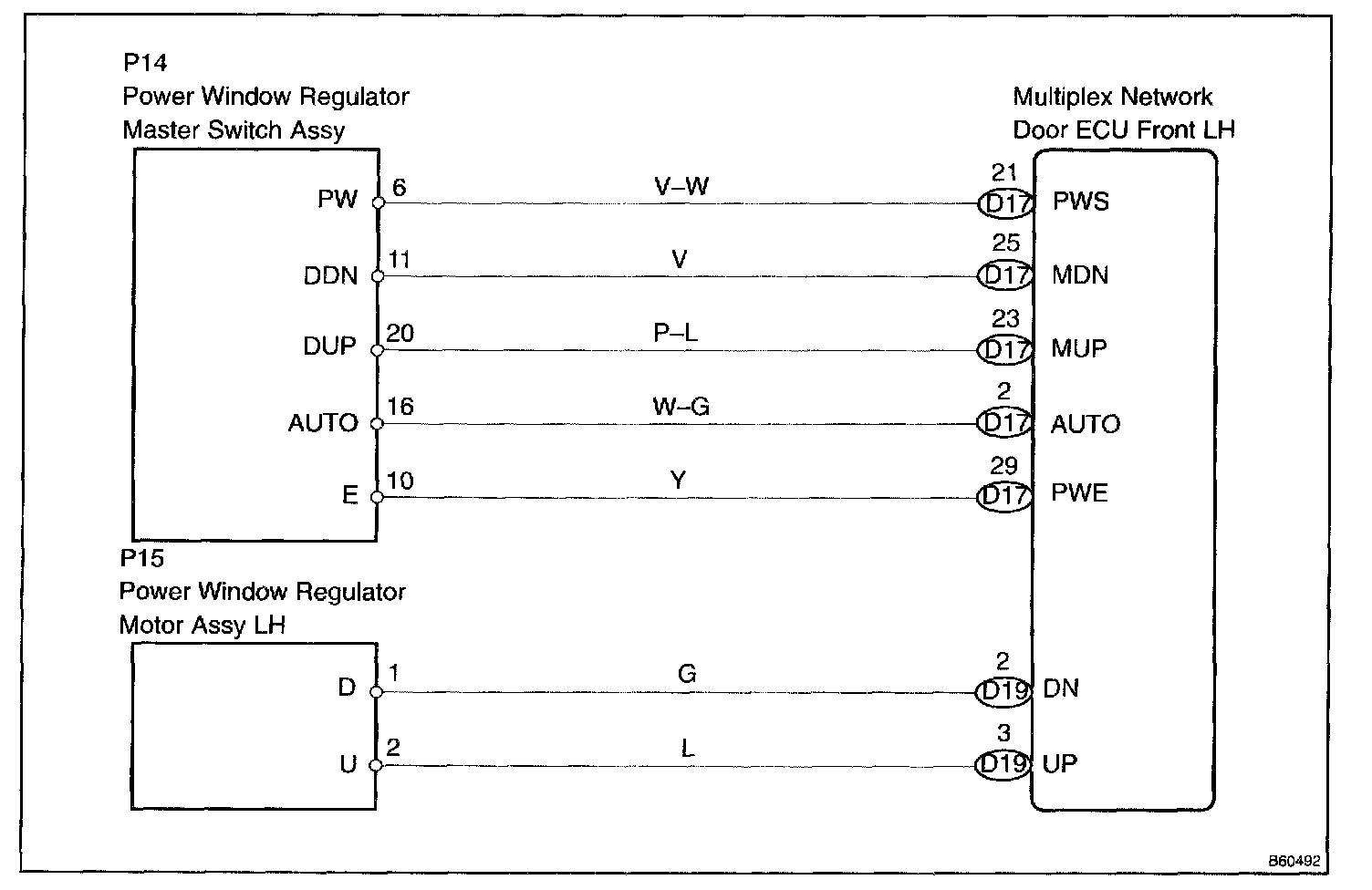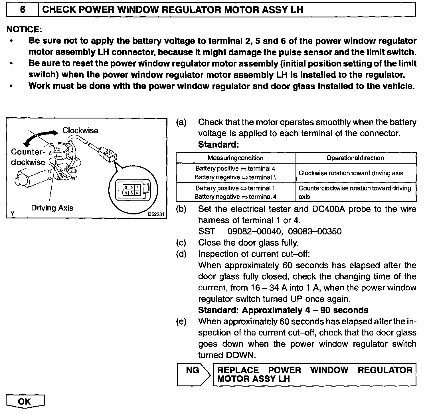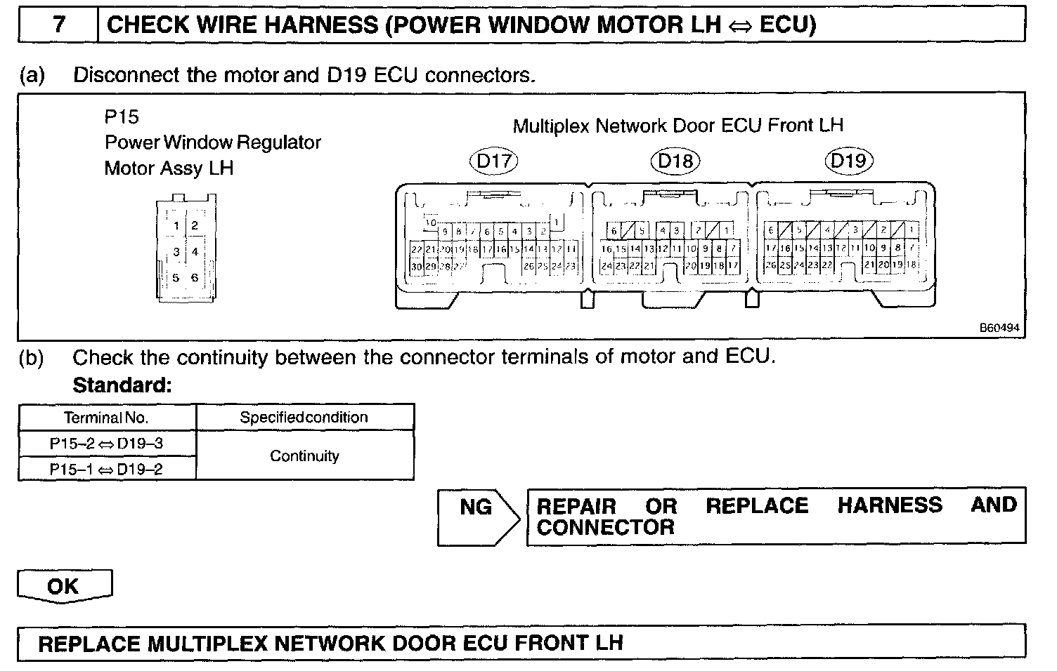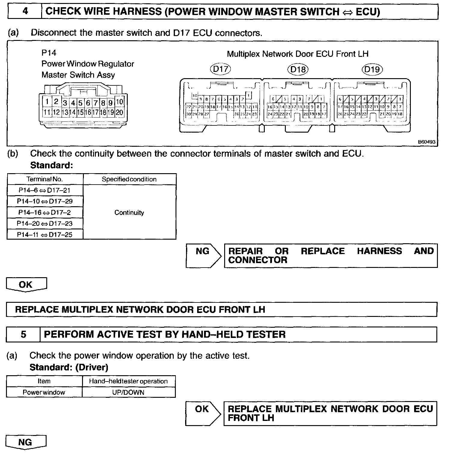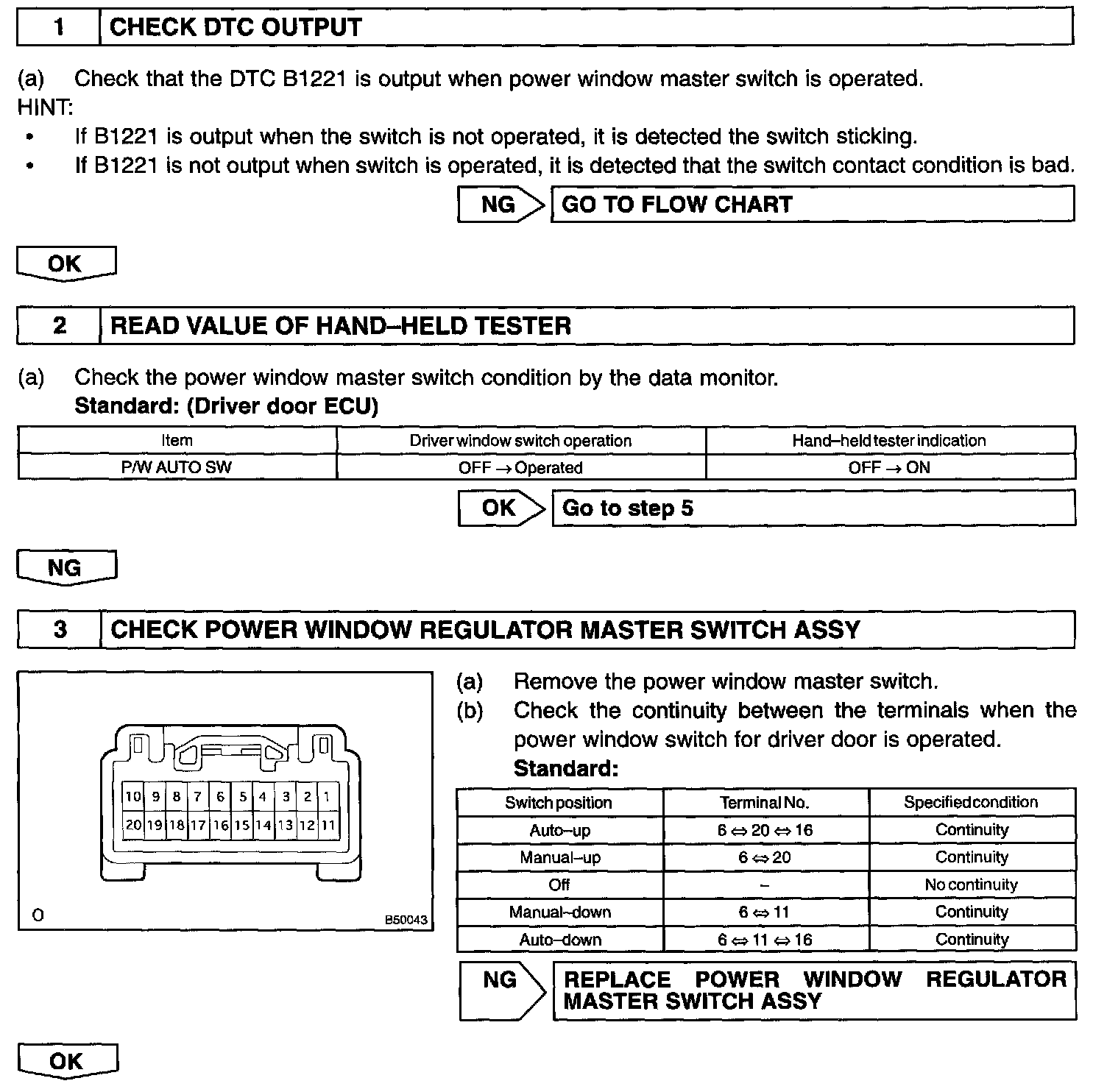 NOTE: The power window system has a function with large-scale body multiplex communications. First of all, inspect the communication function depending on the "How To Proceed With Troubleshooting", and check there is no abnormality in the communication system. Then, finally proceed with the troubleshooting. Also, if the power window system has a malfunction in the jam protection function, the AUTO operations are prohibited. Because of this, confirm that the diagnosis code is normal before the troubleshooting.