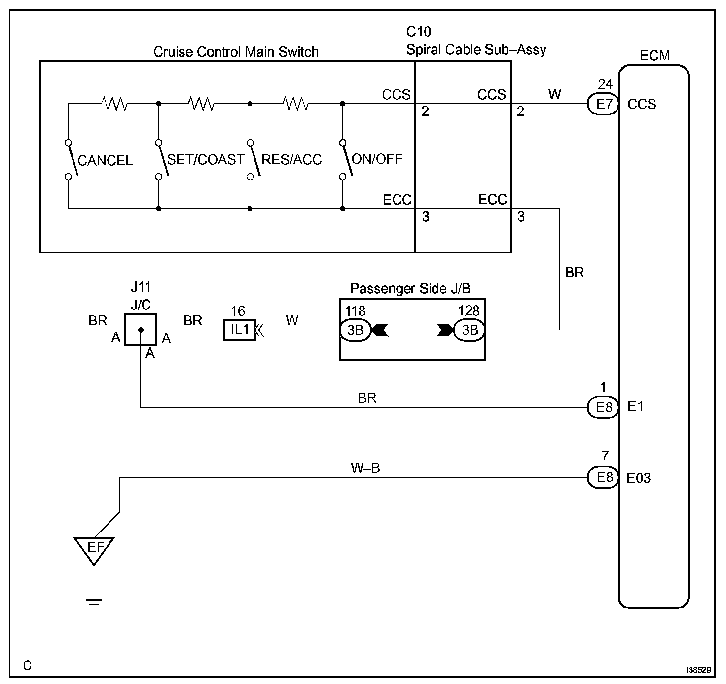 This circuit sends signals to the ECM depending on the cruise control main switch condition.
