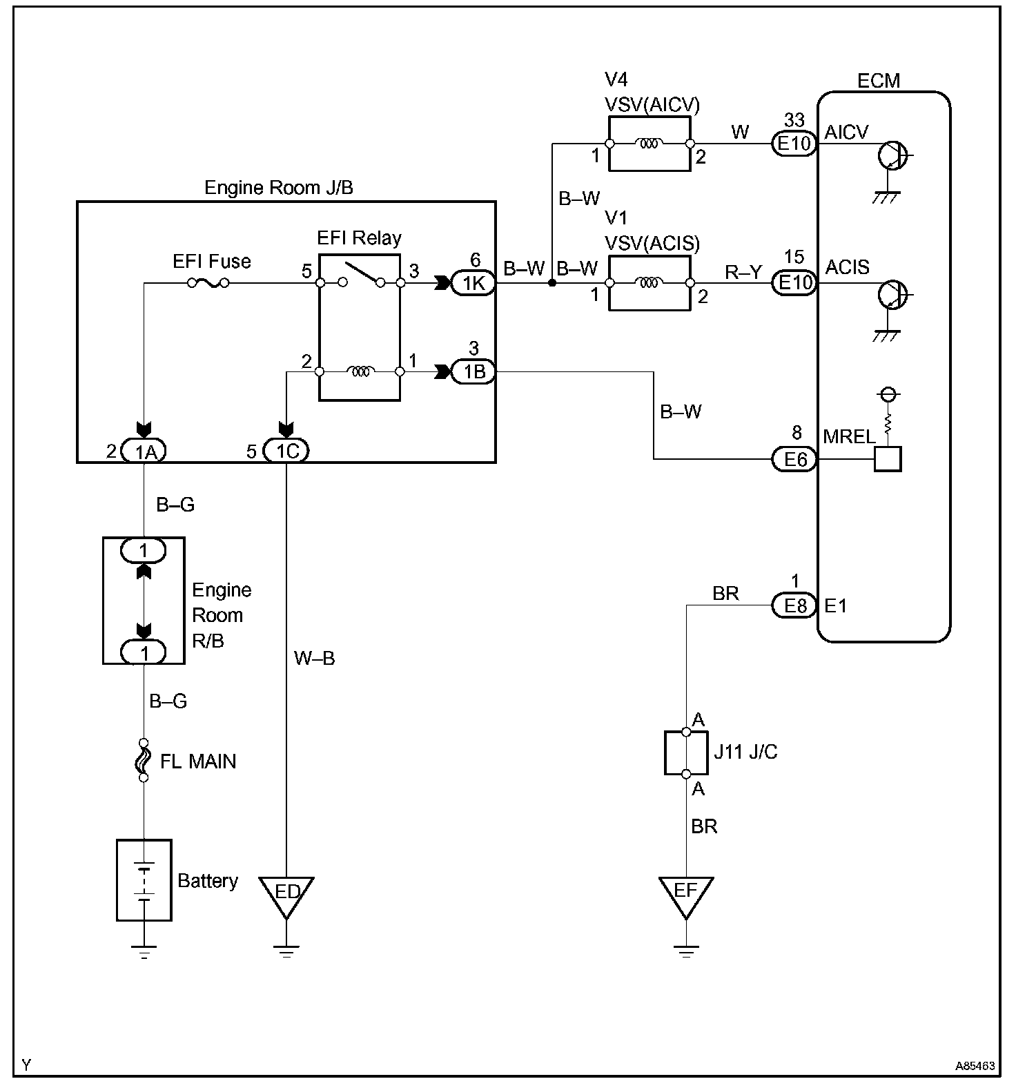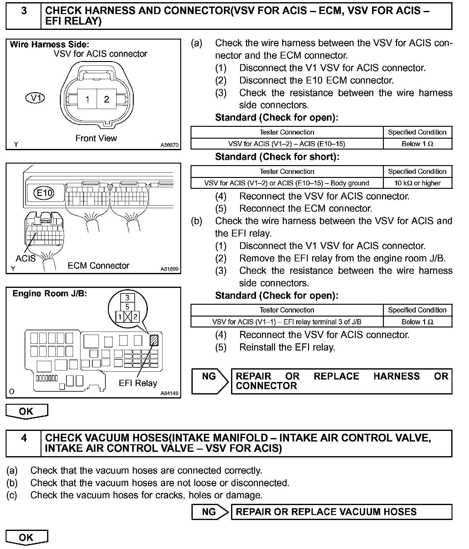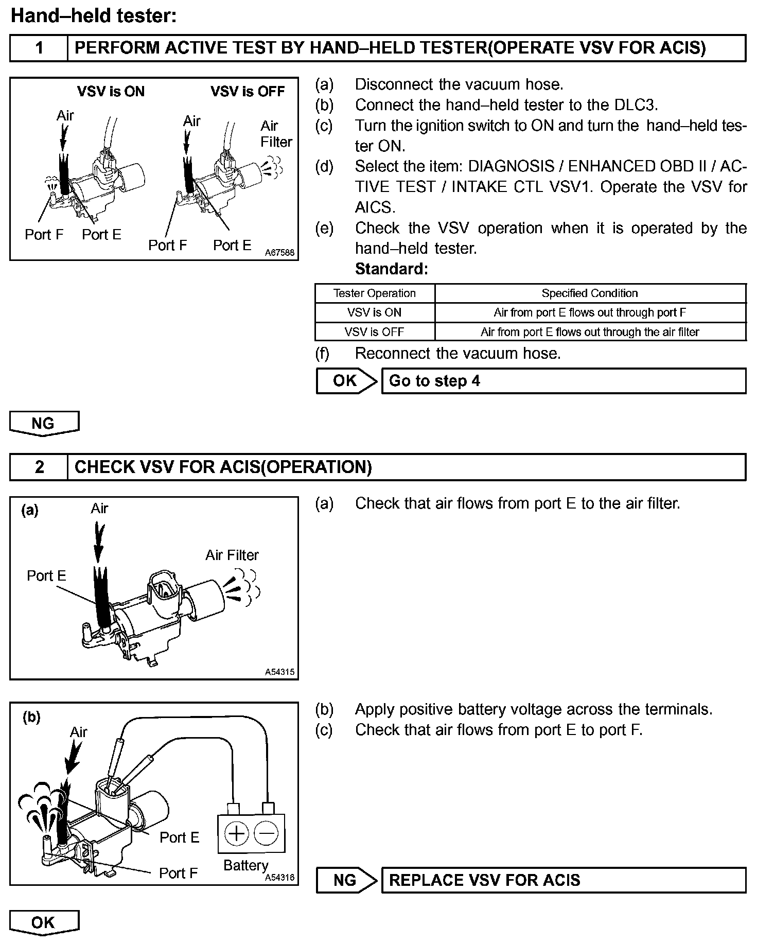 The ECM opens and closes the Intake Air Control valve in response to engine speed (RPM/NE).This system improves intake manifold tuning for better efficiency at low and high engine rpm. When the engine speed is 4,000 rpm or less and the throttle valve opening angle is 30 ° or more, the ECM turns the VSV ON or OFF to operate the intake air control valve.