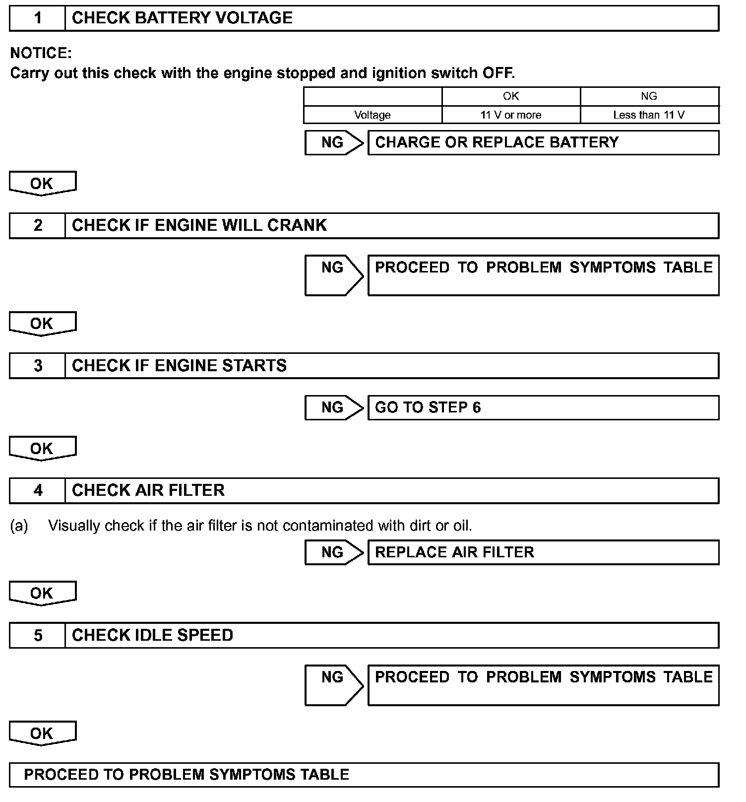 When the malfunction is not confirmed in the DTC check, troubleshooting should be carried out in all the possible circuits considered as causes of the problem. In many cases, by carrying out the basic engine check shown in the given flow chart, the location causing the problem can be found quickly and efficiently. Therefore, using this check is essential in the engine troubleshooting.
