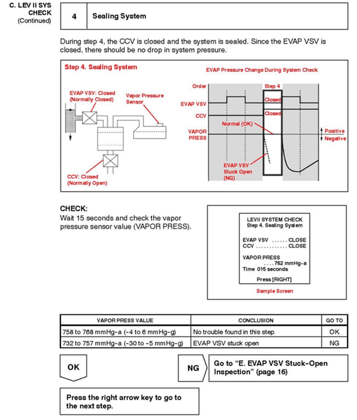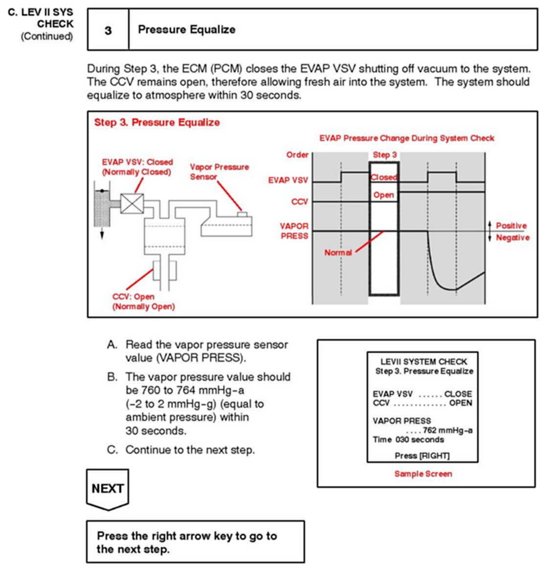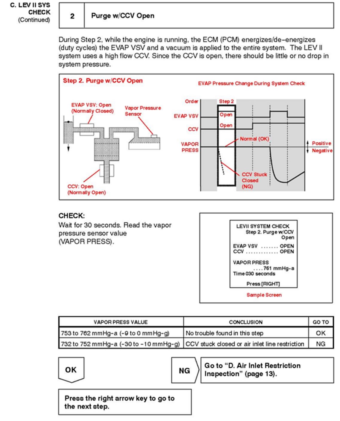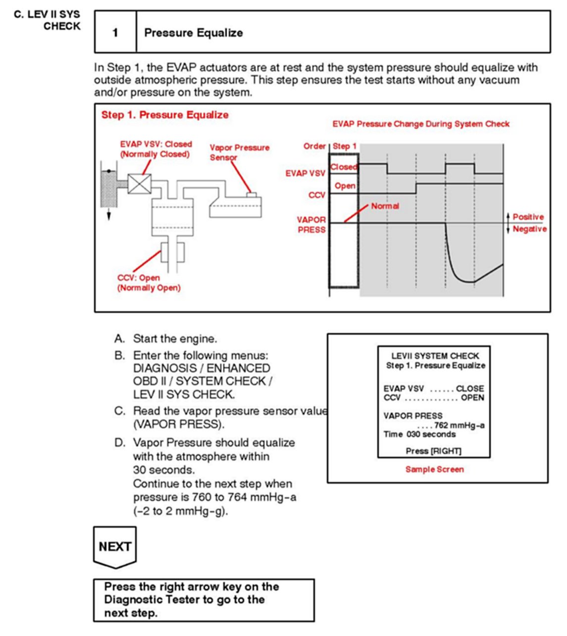 The LEV II System Check allows the Diagnostic Tester to display the fuel tank vapor pressure as the EVAP VSV and the CCV are operated in a specific six-step pattern. Problems with the EVAP system are quickly isolated by observing the change in vapor pressure during each step.