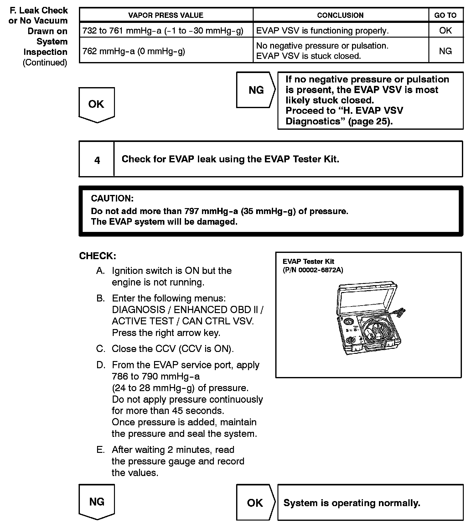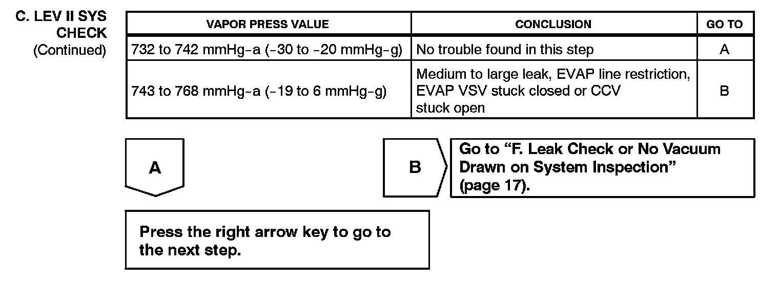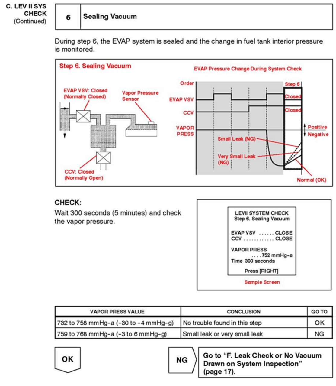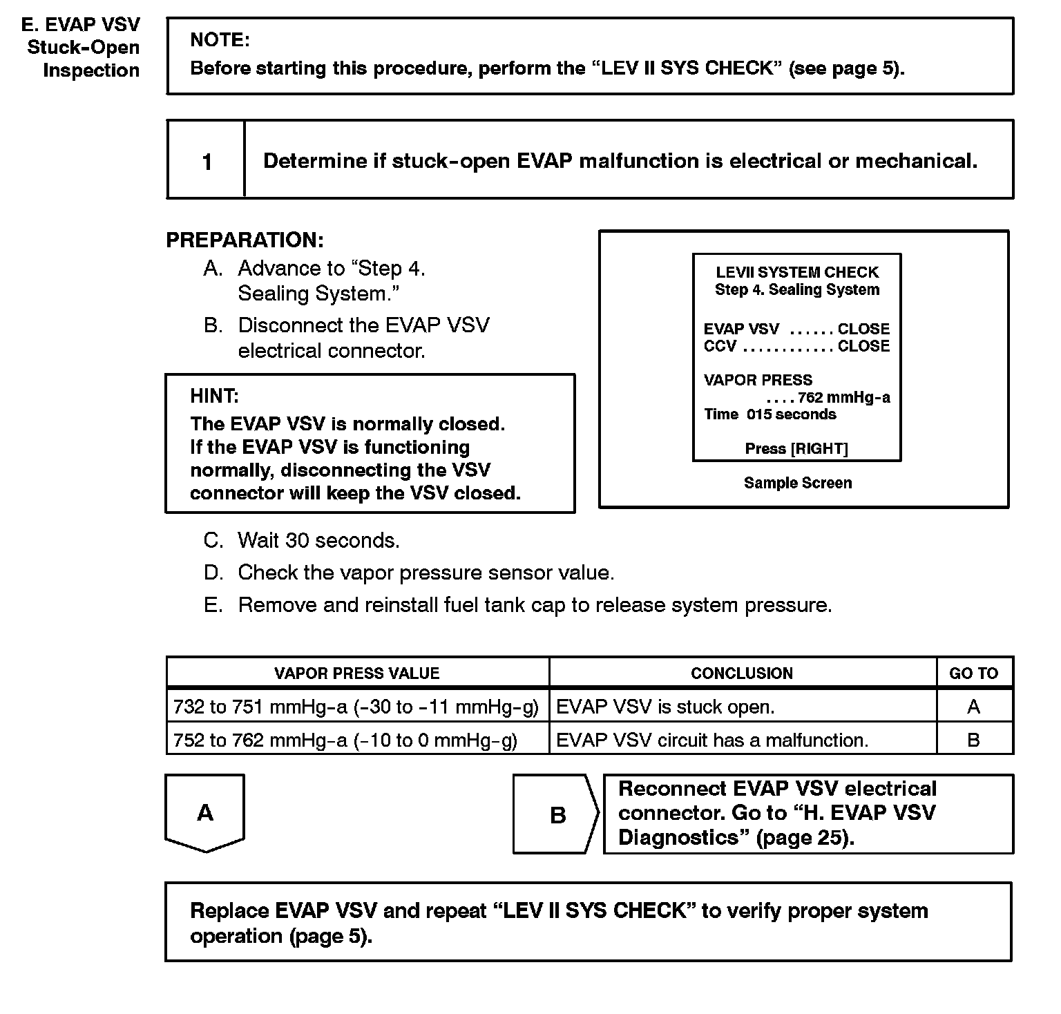 The LEV II System Check allows the Diagnostic Tester to display the fuel tank vapor pressure as the EVAP VSV and the CCV are operated in a specific six-step pattern. Problems with the EVAP system are quickly isolated by observing the change in vapor pressure during each step.