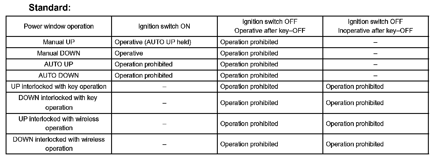 POWER WINDOW FAIL-SAFE FUNCTIONWhen an abnormality is detected in the limit switch and pulse sensor for operating the jam protection function (DTC: B1231, B1232, B1233, B1234), the following power window operations will be prohibited for fail-safe.