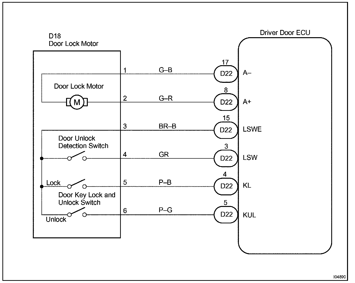 CIRCUIT DESCRIPTIONThe door unlock detection switch is built in the door lock motor assembly. This switch is ON when the door lock knob is in the unlock position and OFF when the lock knob is in the lock position. The ECU detects the door lock knob conditions is this circuit. It is used as one of the operating conditions for the key confinement prevention function.