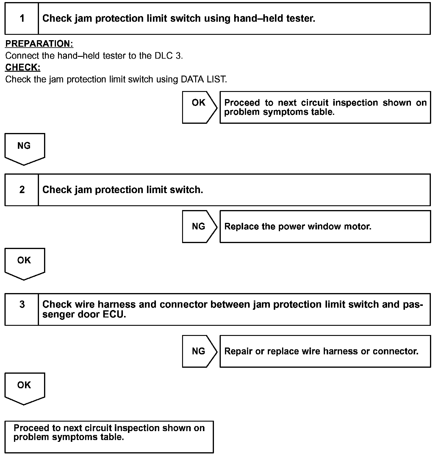 Jam protection limit switch is built-in the power window motor. This switch functions to turn "OFF" before the top dead center, and ECU reads this "OFF" signal resulting in closing the window fully.