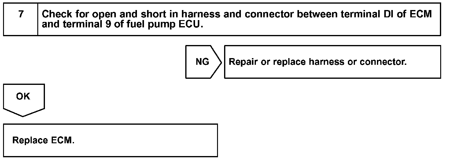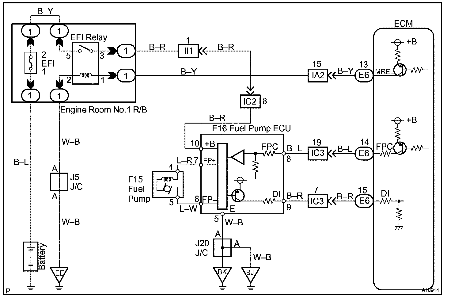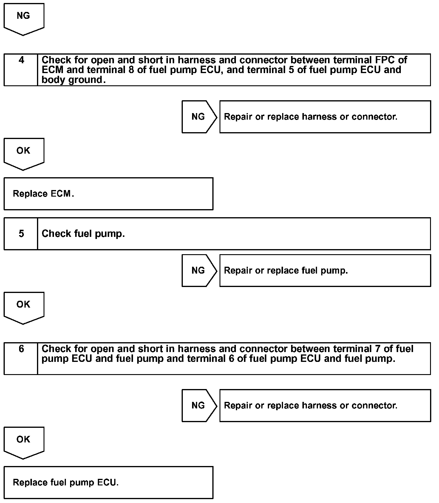 When the engine is idling or carries a light load, the ECM sends a Low signal (about 1.3 V) to the fuel pump ECU (FPC terminal).