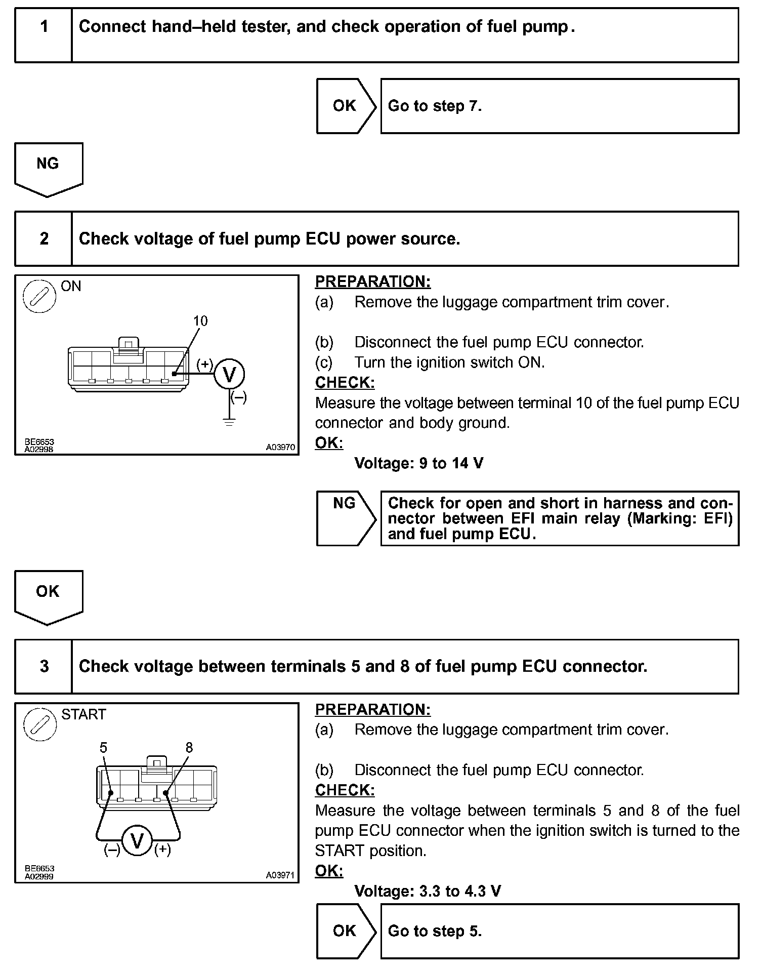The fuel pump ECU then outputs Mid voltage (about 10 V) to the fuel pump so that the fuel pump operates at medium speed.