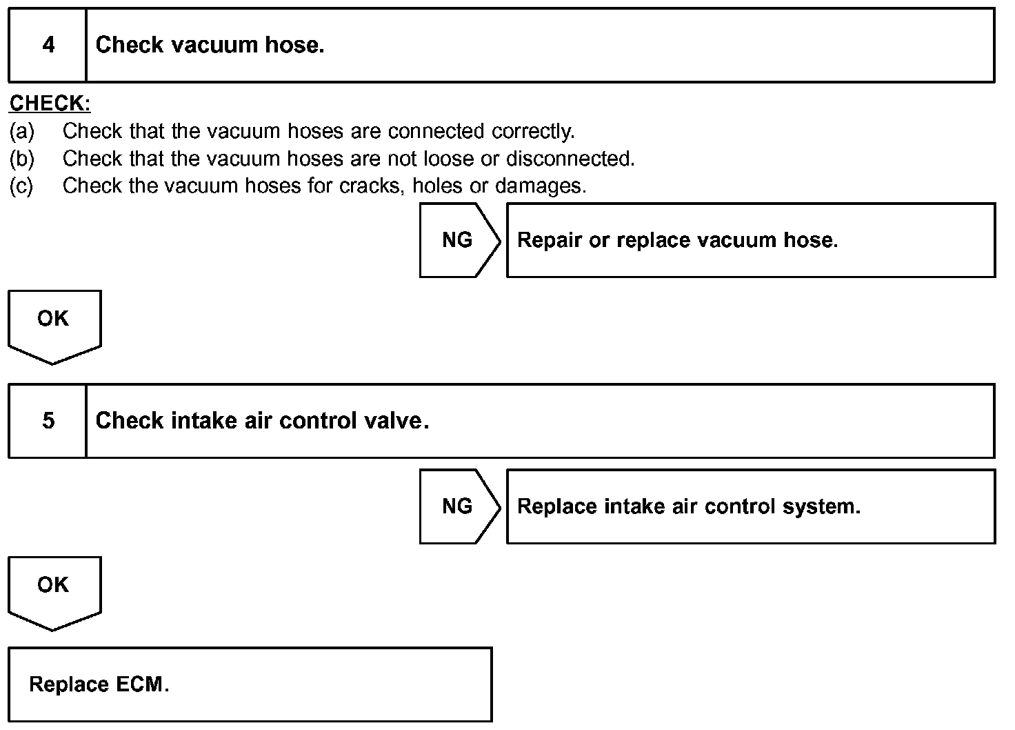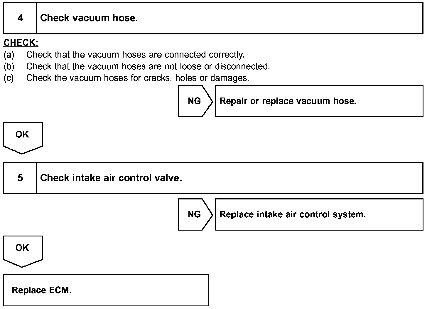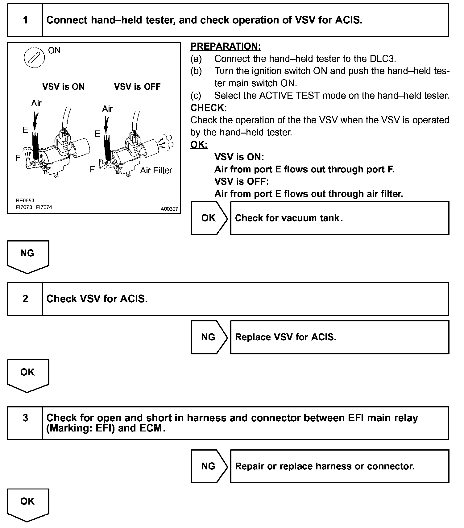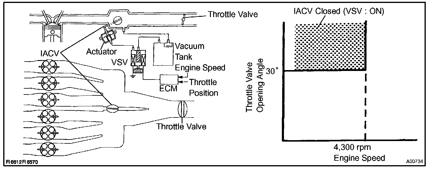 When the engine speed is 4,300 rpm or less and the throttle valve opening angle is 30° or more, the ECM turns the VSV ON and closes the IACV. At all other times, the VSV is OFF, so that the IACV is open.