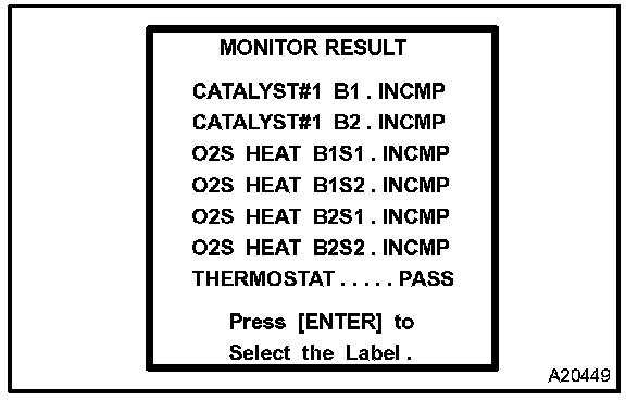 "MONITOR RESULT" from "DIAGNOSIS / ENHANCED OBD II / MONITOR INFO / MONITOR RESULT" the Test ID will appear at the beginning of each line, following by INCMP, PASS or FAIL.