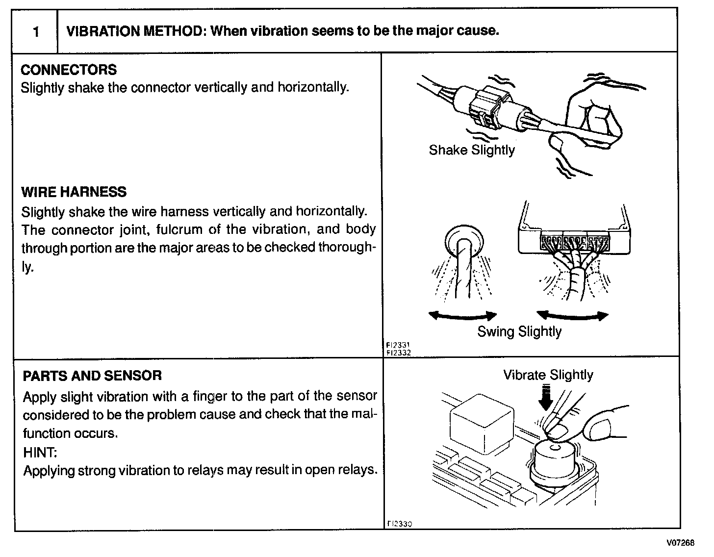 SYMPTOM SIMULATIONThe most difficult case in troubleshooting is when there are no problem symptoms occurring. In such cases, a thorough customer problem analysis must be carried out, then simulate the same or similar conditions and environment in which the problem occurred in the customer's vehicle. No matter how much experience a technician has, or how skilled he may be, if he proceeds to troubleshoot without confirming the problem symptoms he will tend to overlook something important in the repair operation and make a wrong guess somewhere, which will only lead to a standstill. For example, for a problem which only occurs when the engine is cold, or for a problem which occurs due to vibration caused by the road during driving, etc., the problem can never be determined so long as the symptoms are confirmed with the engine hot condition or the vehicle at a standstill. Since vibration, heat or water penetration (moisture) is likely cause for problem which is difficult to reproduce, the symptom simulation tests introduced here are effective measures in that the external causes are applied to the vehicle in a stopped condition.