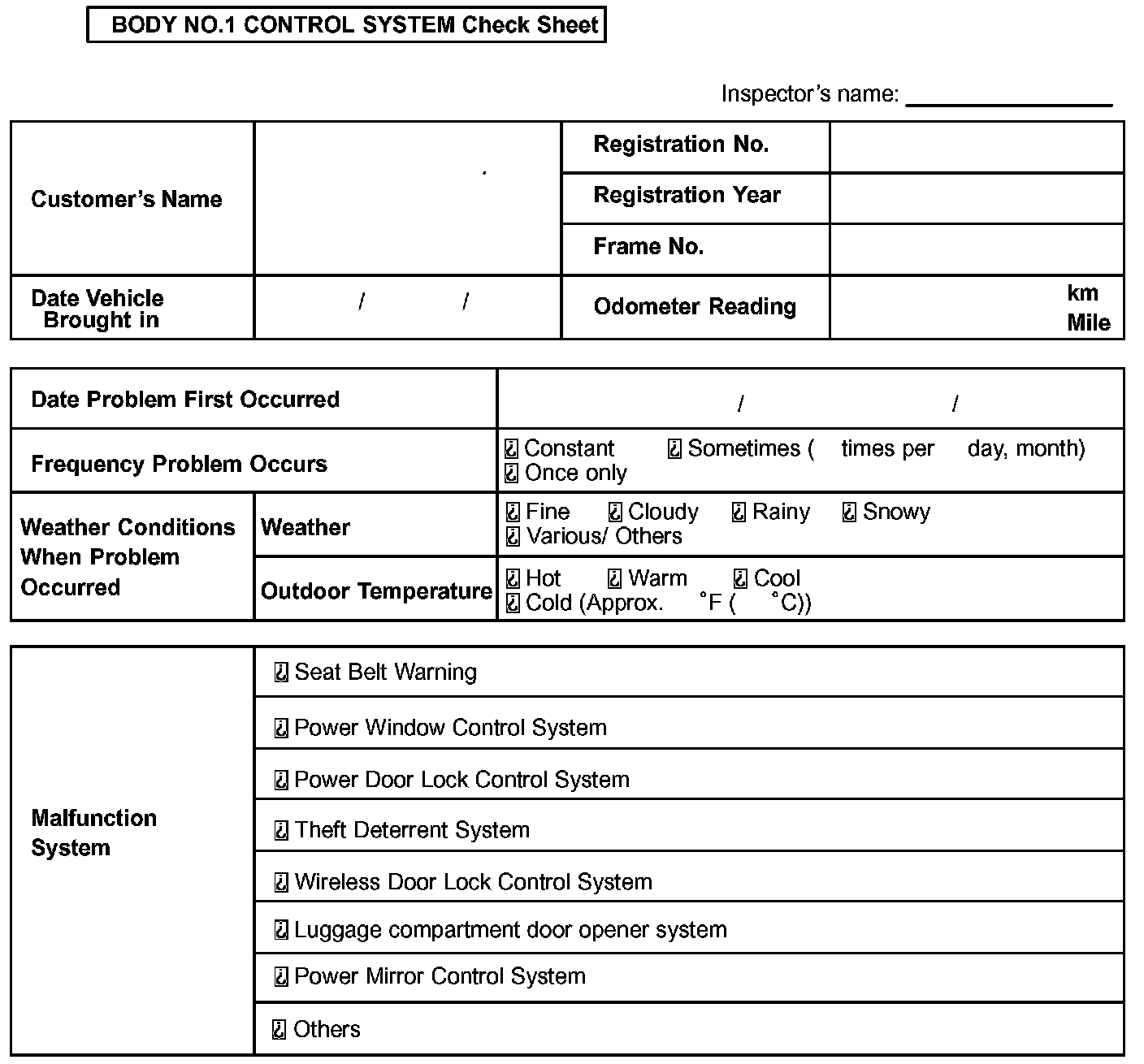 Body No.1 Control System Check Sheet: