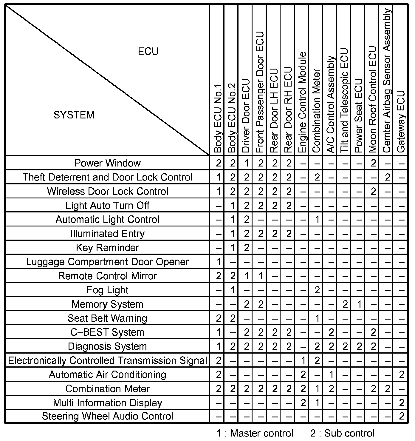 The system is comprised of the communication modes of the body ECU No.1, body ECU No.2, driver door ECU, front passenger door ECU, rear door LH ECU, rear door RH ECU, engine control module, combination meter, A/C control assembly, tilt and telescopic ECU, power seat ECU, moon roof control ECU, center airbag sensor assembly and gateway ECU. The body electrical systems are controlled by a serial communication in which each ECU is linked to another via a single communication line. This system is also equipped with a self-diagnosis function.