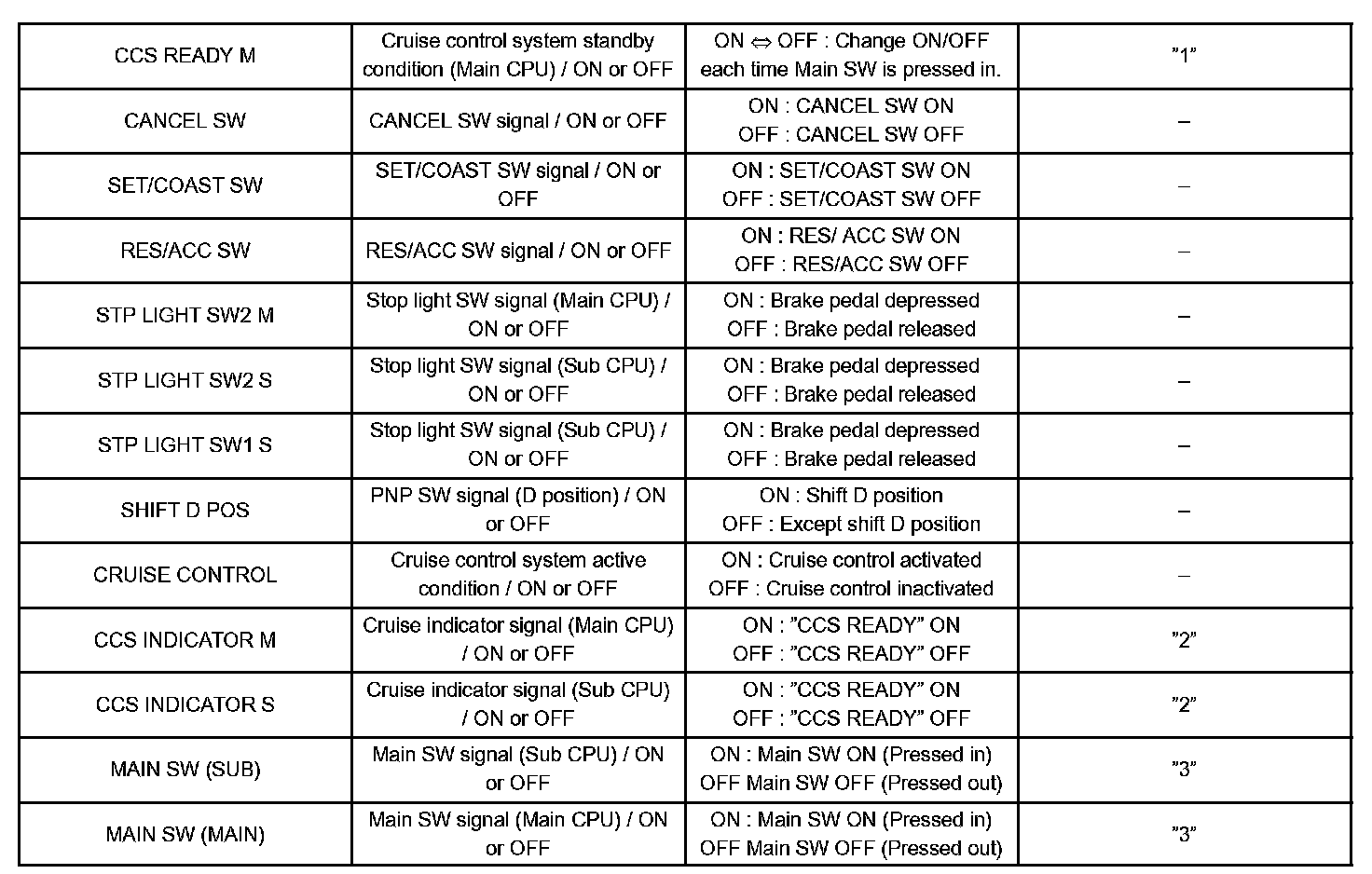 "3" is OK but cruise indicator not turn on -> Indicator or W/H or ECM failure.