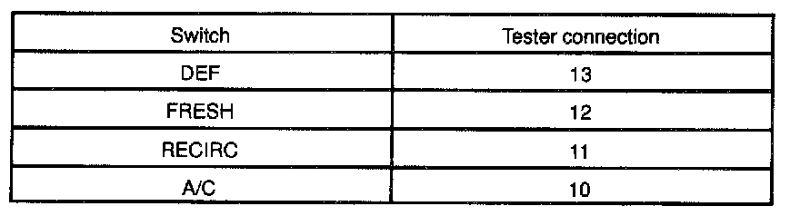 Connect the positive (+) lead from the battery to terminal 4 and negative (-) lead to each terminal, then check that the indicator lights up as shown in the chart.