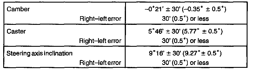 If the caster and steering axis inclination are not within the specified values, after the camber has been correctly adjusted, recheck the suspension parts for damaged and/or worn out parts.