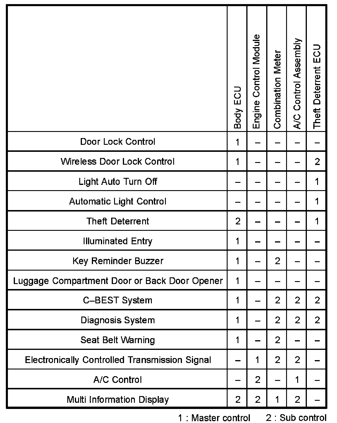 The system is comprised of the communication modes of the body ECU,engine control module,theft deterrent ECU,power window master SW,combination meter and A/C control assembly.The body electrical systems are controlled by a serial communication in which each ECU is linked to another via a single communication line.This system is also equipped with a self-diagnosis function.